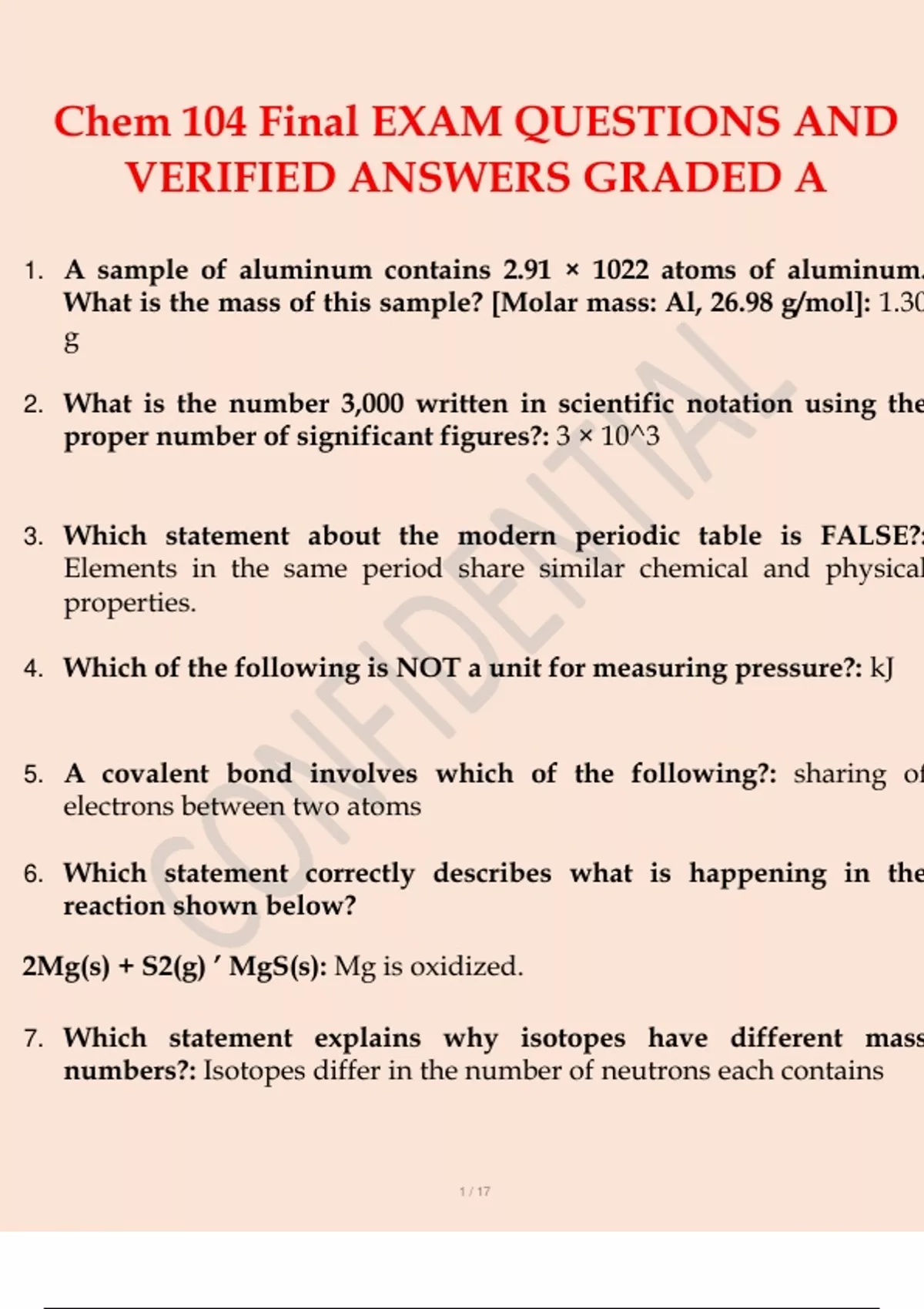 Chem 104 Final EXAM QUESTIONS AND VERIFIED ANSWERS GRADED A Chem 104 Final EXAM QUESTIONS AND VERIFIED ANSWERS GRADED A Chem 104 Final EXAM QUESTIONS AND VERIFIED ANSWERS GRADED AChem 104 Final EXAM QUESTIONS AND VERIFIED ANSWERS GRADED A