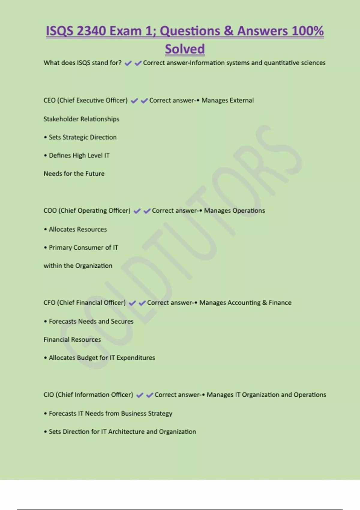 CIO (Chief Information Officer) Correct answer-• Manages IT Organization and Operations