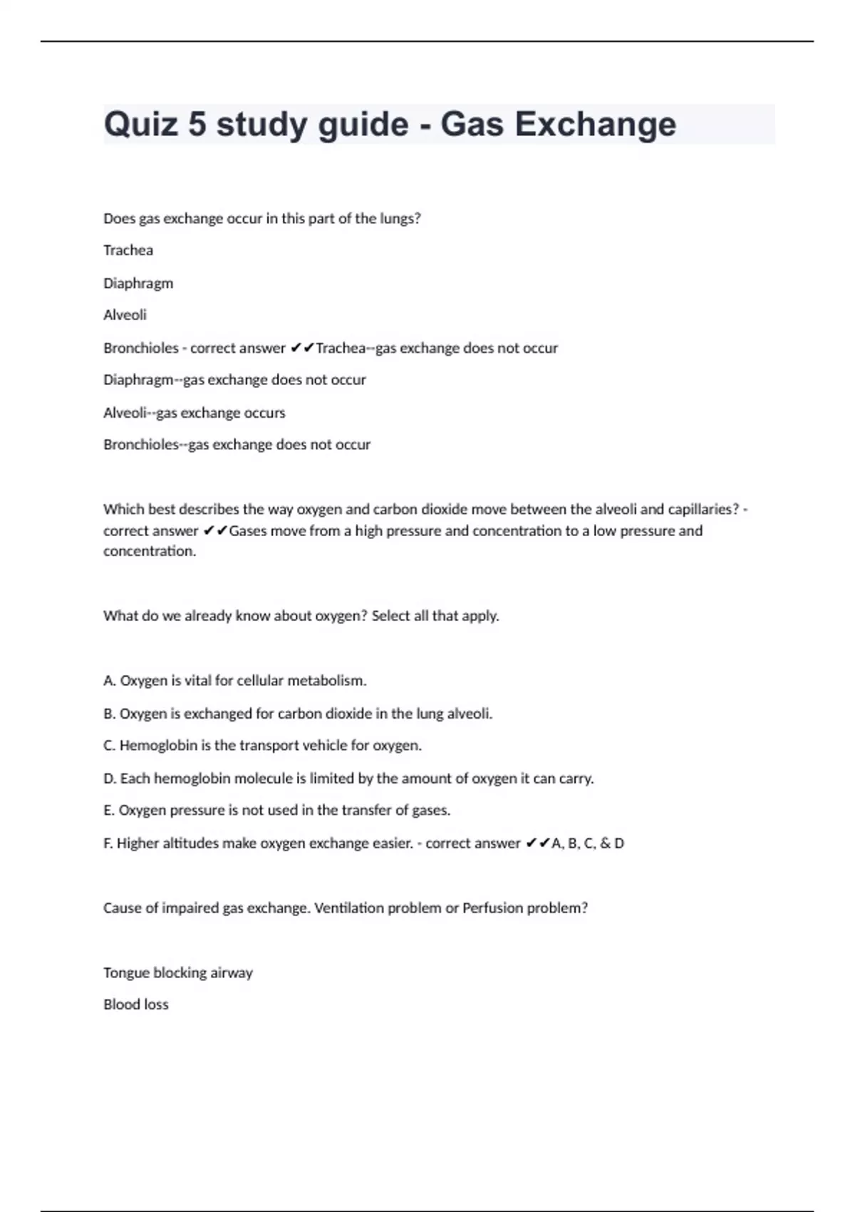 F. Higher altitudes make oxygen exchange easier. - correct answer ✔✔A, B, C, & D