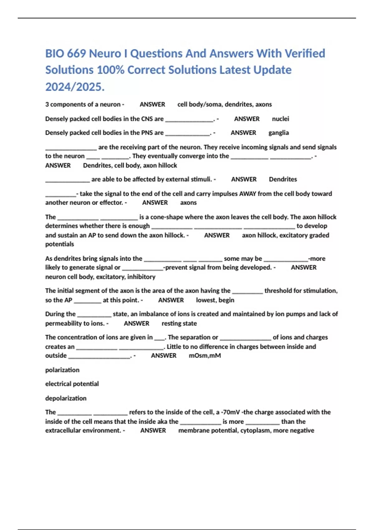 BIO 669 Neuro I Questions And Answers With Verified