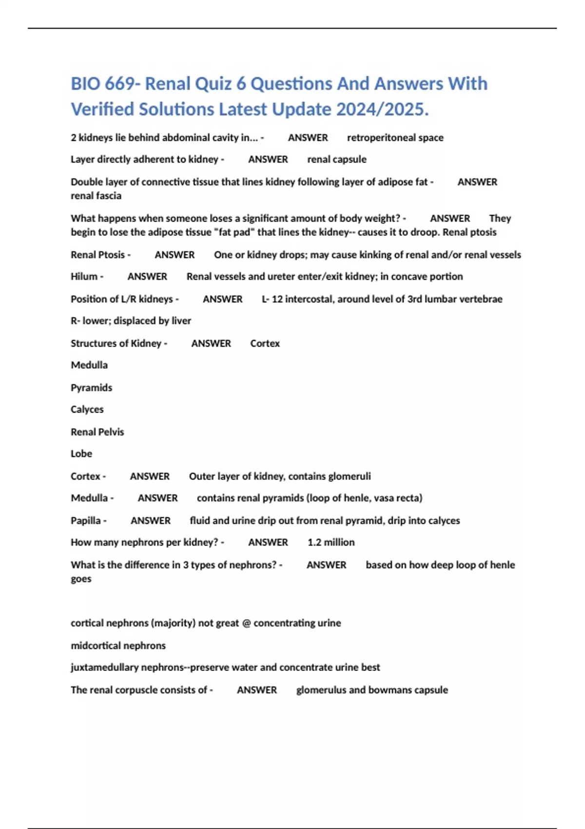 BIO 669- Renal Quiz 6 Questions And Answers With