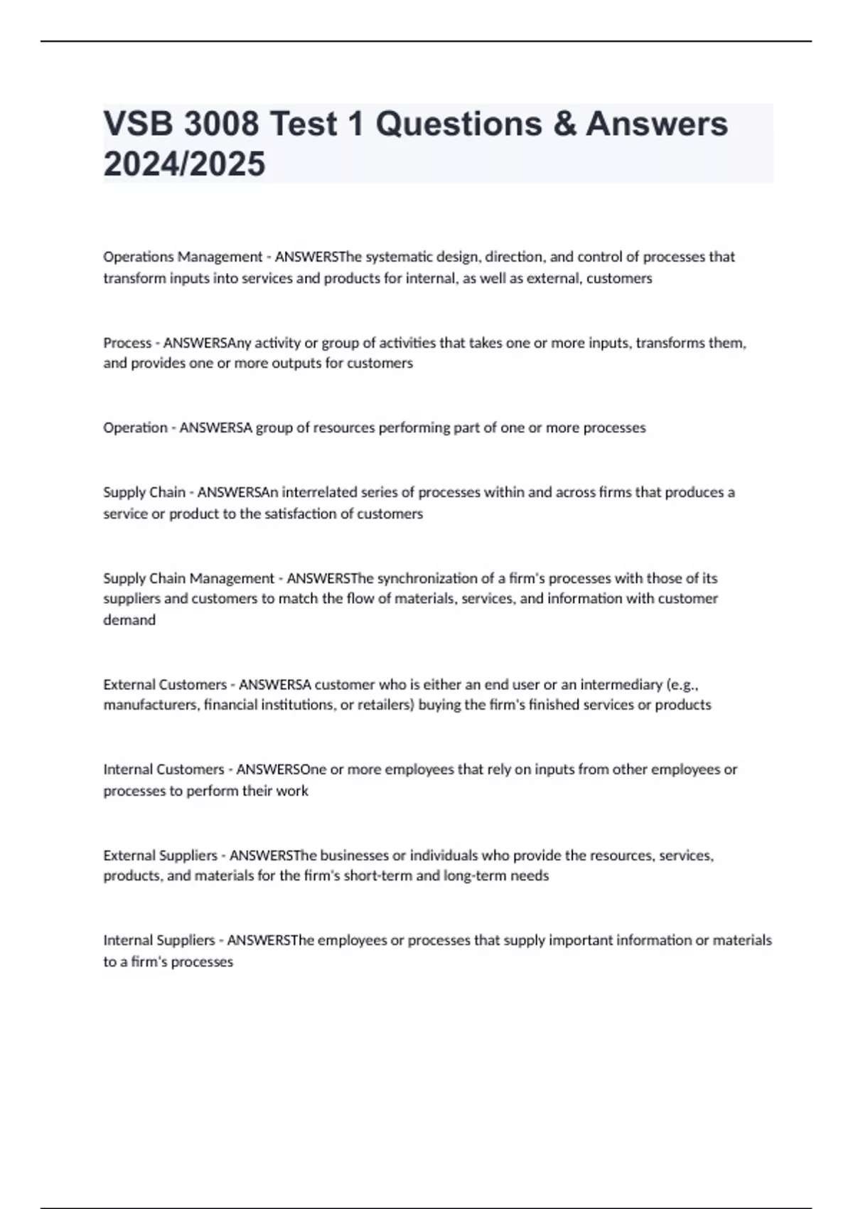 Supply Chain - ANSWERSAn interrelated series of processes within and across firms that produces a