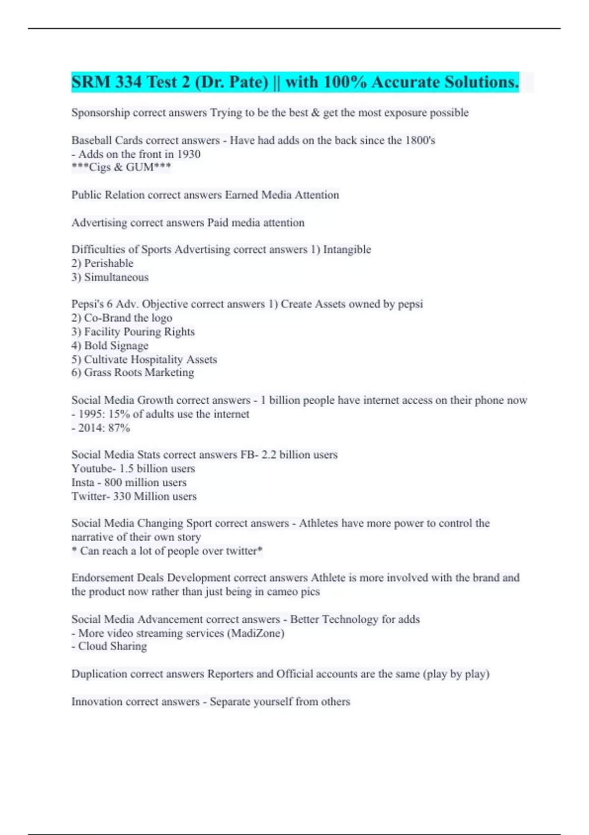 Difficulties of Sports Advertising correct answers 1) Intangible