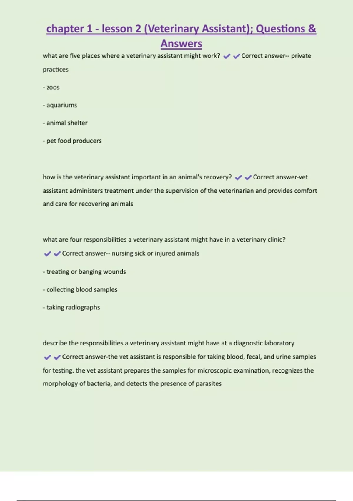 Correct answer-the vet assistant is responsible for taking blood, fecal, and urine samples