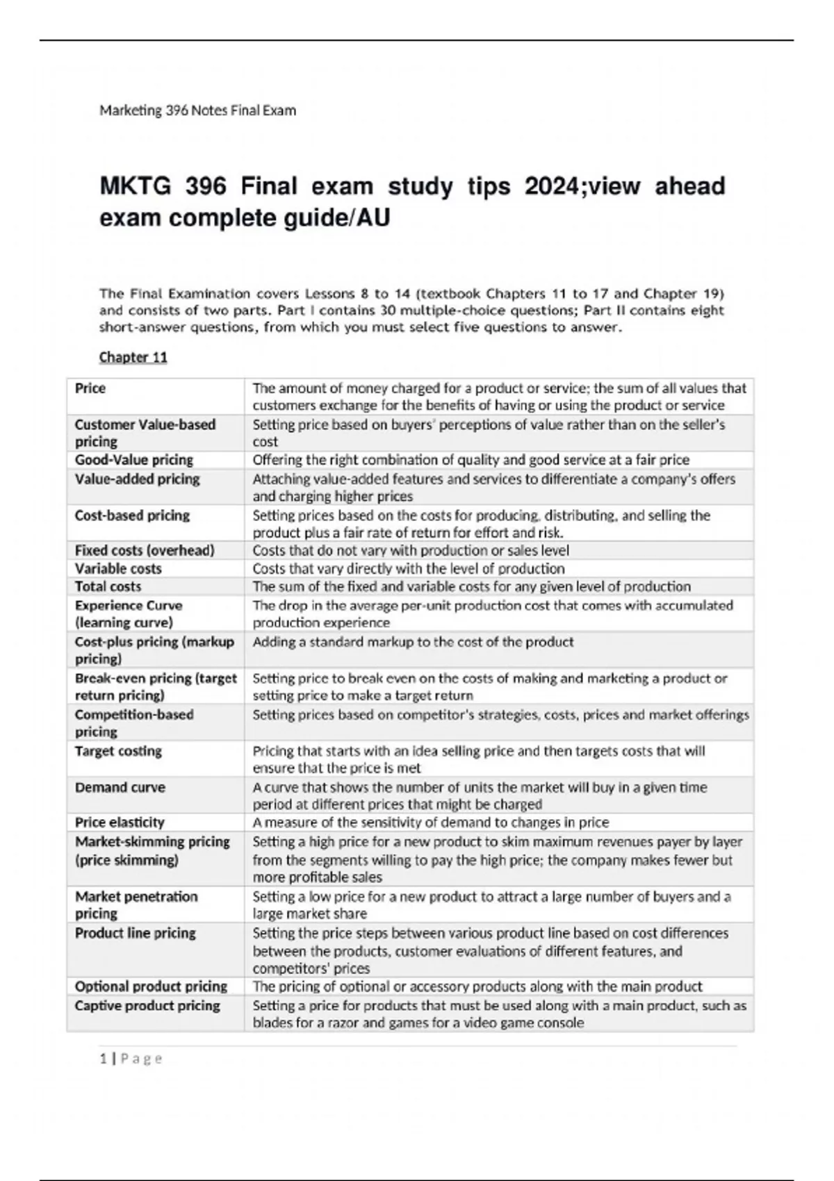 MKTG 396 Final exam study tips 2024;view ahead exam complete guide/AU