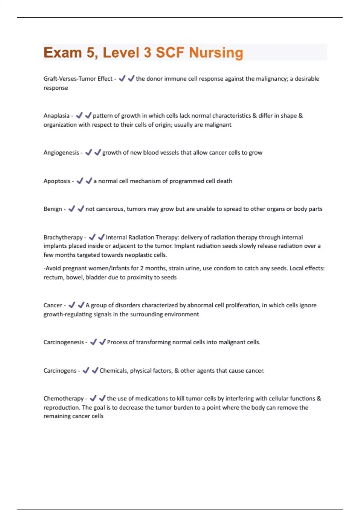 Graft-Verses-Tumor Effect - the donor immune cell response against the malignancy; a desirable response Anaplasia - pattern of growth in which cells lack normal characteristics & differ in shape & organization with respect to their cells of origin; usually are malignant Angiogenesis - growth of new blood vessels that allow cancer cells to grow Apoptosis - a normal cell mechanism of programmed cell death Benign - not cancerous, tumors may grow but are unable to spread to other organs or body parts Brachytherapy - Internal Radiation Therapy: delivery of radiation therapy through internal implants placed inside or adjacent to the tumor. Implant radiation seeds slowly release radiation over a few months targeted towards neoplastic cells. -Avoid pregnant women/infants for 2 months, strain urine, use condom to catch any seeds. Local effects: rectum, bowel, bladder due to proximity to seeds Cancer - A group of disorders characterized by abnormal cell proliferation, in which cells ignore growth-regulating signals in the surrounding environment Carcinogenesis - Process of transforming normal cells into malignant cells. Carcinogens - Chemicals, physical factors, & other agents that cause cancer. Chemotherapy - the use of medications to kill tumor cells by interfering with cellular functions & reproduction. The goal is to decrease the tumor burden to a point where the body can remove the remaining cancer cellsCytokines - Substances produced primarily by cells of the immune system to enhance production & functioning of components of the immune system. Extravasation - Leakage of intravenous medication from the veins into the subcutaneous tissues -Use central line for vesicants/chemotherapy drugs -If a peripheral vein is used monitor site, don't use a small vein -Stop the infusion if suspected & call physician -Educate pt to report changes to the site, feelings, swelling, pain -Antidotes exist depending on med -Occurrence report Alopecia - Hair loss Grading - Identification of the type of tissue from which the tumor originated & the degree to which the tumor cells retain the functional & structural characteristics of the tissue or origin Graft-Verses-Host Disease (GVHD) - an immune response initiated by T lymphocytes of donor tissue against the recipients tissues (skin, gastrointestinal tract, liver); an undesirable response Malignant - having cells or processes that are characteristic of cancer Metastasis - spread of cancer cells from the primary tumor to distant sites