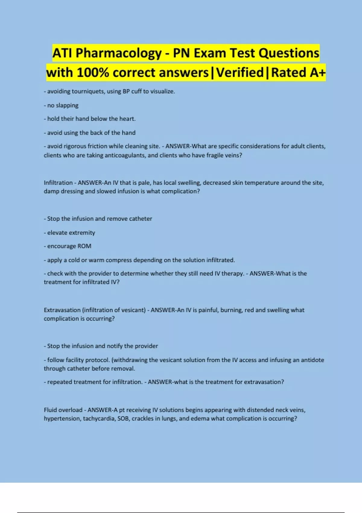 - avoiding tourniquets, using BP cuff to visualize. - no slapping - hold their hand below the heart. - avoid using the back of the hand - avoid rigorous friction while cleaning site. - ANSWER-What are specific considerations for adult clients, clients who are taking anticoagulants, and clients who have fragile veins? Infiltration - ANSWER-An IV that is pale, has local swelling, decreased skin temperature around the site, damp dressing and slowed infusion is what complication? - Stop the infusion and remove catheter - elevate extremity - encourage ROM - apply a cold or warm compress depending on the solution infiltrated. - check with the provider to determine whether they still need IV therapy. - ANSWER-What is the treatment for infiltrated IV? Extravasation (infiltration of vesicant) - ANSWER-An IV is painful, burning, red and swelling what complication is occurring? - Stop the infusion and notify the provider - follow facility protocol. (withdrawing the vesicant solution from the IV access and infusing an antidote through catheter before removal. - repeated treatment for infiltration. - ANSWER-what is the treatment for extravasation? Fluid overload - ANSWER-A pt receiving IV solutions begins appearing with distended neck veins, hypertension, tachycardia, SOB, crackles in lungs, and edema what complication is occurring? - Slow IV rate or stop. - raise HOB - monitor VS & O2 - Adjust the rate after correcting fluid. - anticipate administering diuretics - ANSWER-What is the treatment for fluid overload? Phlebitis/thrombophlebitis - ANSWER-A pt with an IV appears edematous, erythema, throbbing, burning, or pain at the site, increased skin temperature, red line, and slowed infusion are s/s of what IV complication? - promptly d/c the infusion and remove the catheter. - elevate extremity - apply a cold compress to minimize flow of blood, then warm to increase circulation. - restart if needed. - obtain a specimen for culture at site. - ANSWER-what treatments are there for phlebitis/thrombophlebitis? - Rotate sites at least every 72 hours according to facility policy. - Monitory IV sites using phlebitis scale - avoid lower extremities - use hand hygiene - use surgical aseptic technique. - ANSWER-What are some ways to prevent thrombophlebitis?