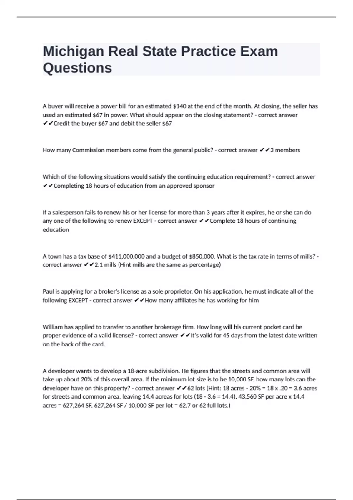 developer have on this property? - correct answer ✔✔62 lots (Hint: 18 acres - 20% = 18 x .20 = 3.6 acres