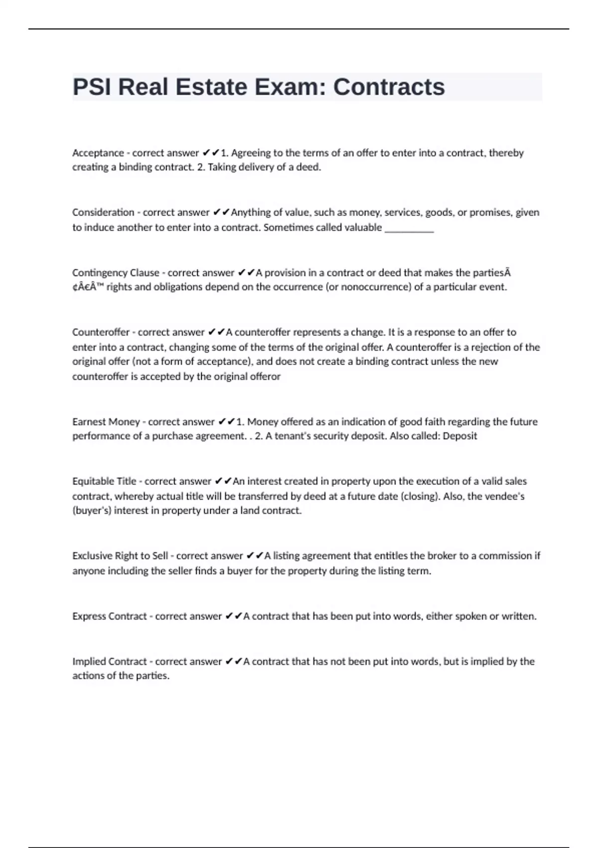 Contingency Clause - correct answer ✔✔A provision in a contract or deed that makes the partiesÃ