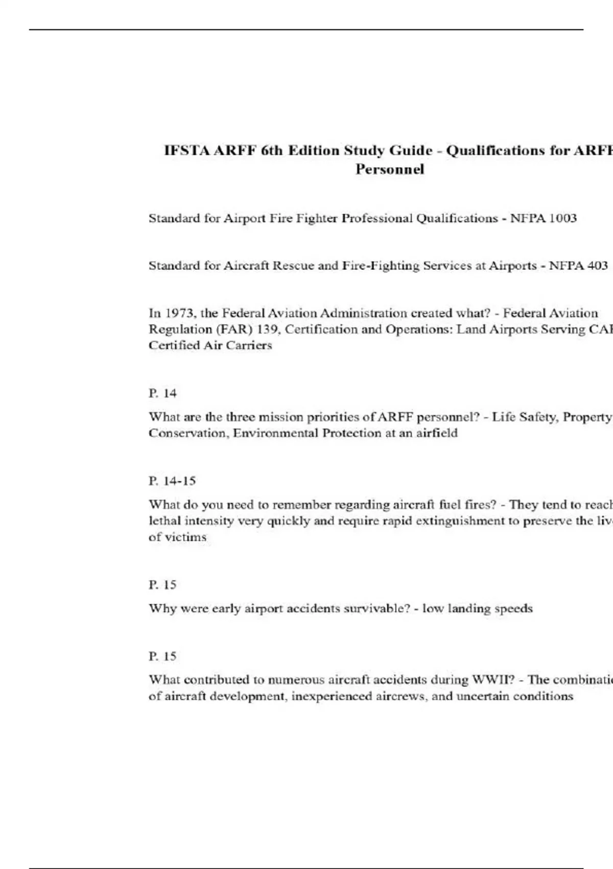 Standard for Airport Fire Fighter Professional Qualifications - NFPA 1003 Standard for Aircraft Rescue and Fire-Fighting Services at Airports - NFPA 403 In 1973, the Federal Aviation Administration created what? - Federal Aviation Regulation (FAR) 139, Certification and Operations: Land Airports Serving CABCertified Air Carriers P. 14 What are the three mission priorities of ARFF personnel? - Life Safety, Property Conservation, Environmental Protection at an airfield P. 14-15 What do you need to remember regarding aircraft fuel fires? - They tend to reach lethal intensity very quickly and require rapid extinguishment to preserve the lives of victims P. 15 Why were early airport accidents survivable? - low landing speeds P. 15 What contributed to numerous aircraft accidents during WWII? - The combination of aircraft development, inexperienced aircrews, and uncertain conditionsP. 15 What does CFR stand for? - Crash Fire Rescue P. 15 What helped CFR progress? - WWII- increased fuel loads and crashes helped the military push this forward with experience P. 15 Research conducted by the military after WWII changed what in CFR? - Improvements in fire apparatus (size, speed, discharge capability); protein foam was used instead of carbon dioxide P. 15-16 What caused increased interest in CFR? - Advent of commercial jet aircraft that contain large passenger and fuel capacities What portion of Federal Aviation Regulation (FAR) Part 139 specifies types of extinguishing agents? - P. 16 Why has ARFF continued to evolve? - International Civil Aviation Organization (ICAO) NFPA P. 15 What organization is in charge of regulating aviation in the US? - FAAP. 16 What organization can provide funding for ARFF equipment and vehicles? - Airport Improvement Program (AIP) P. 19 What organization leads investigations on the probable cause of aircraft accidents? - National Transportation Safety Board (NTSB) P. 19 The Transportation Security Administration is a component of what group? - Department of Homeland Security and was established after 9/11/2001 P. 19 What organization has members from different sectors of the fire protection field? - NFPA- come from education, product, response, and scientific sectors P. 20 Which organization represents the regulatory authority for aviation in Europeans States associated with the European Civil Aviation Conference (ECAC)? - Joint Aviation Authority (JAA)