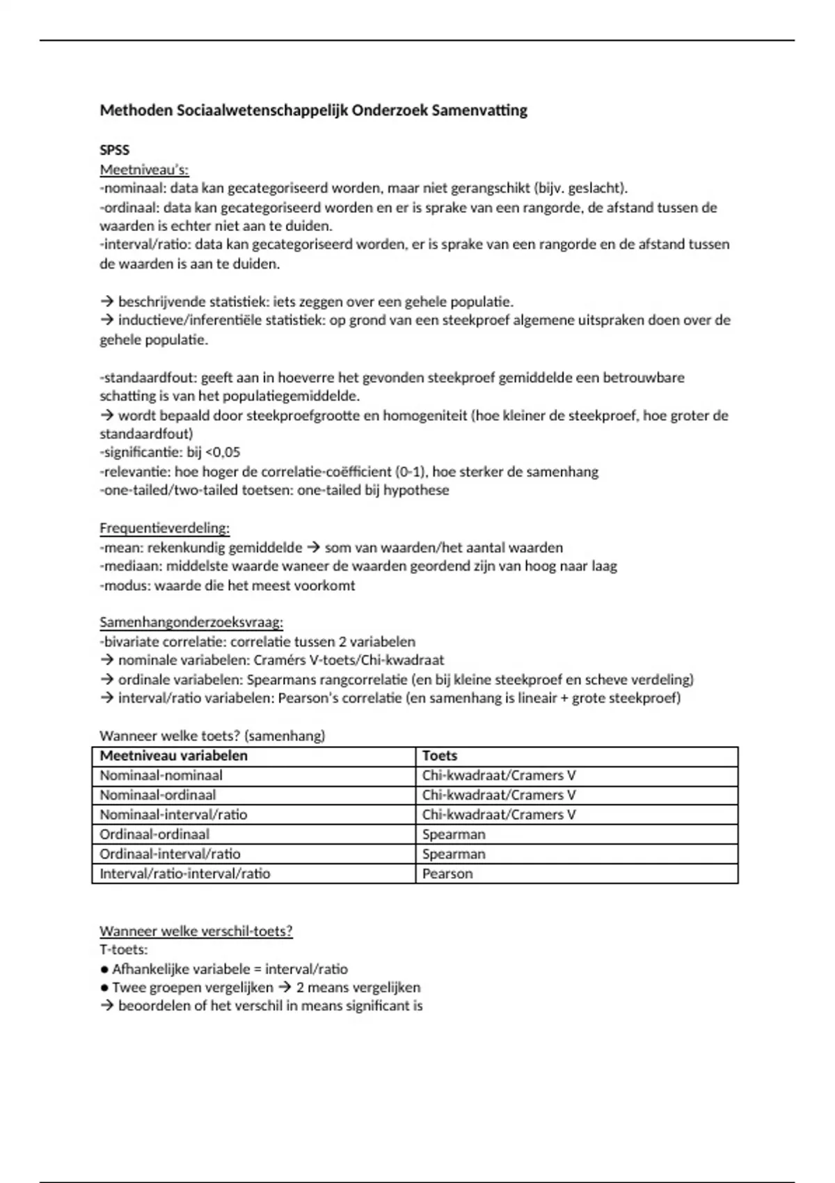 Deze samenvatting bestaat uit de collegestof, de stof uit het boek en de SPSS theorie (meetniveaus, samenhang, de verschillende toetsen etc).