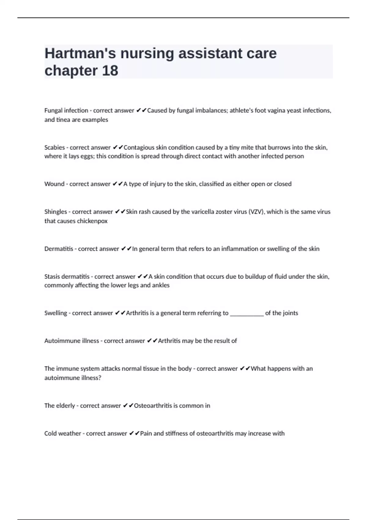 Cold weather - correct answer ✔✔Pain and stiffness of osteoarthritis may increase with