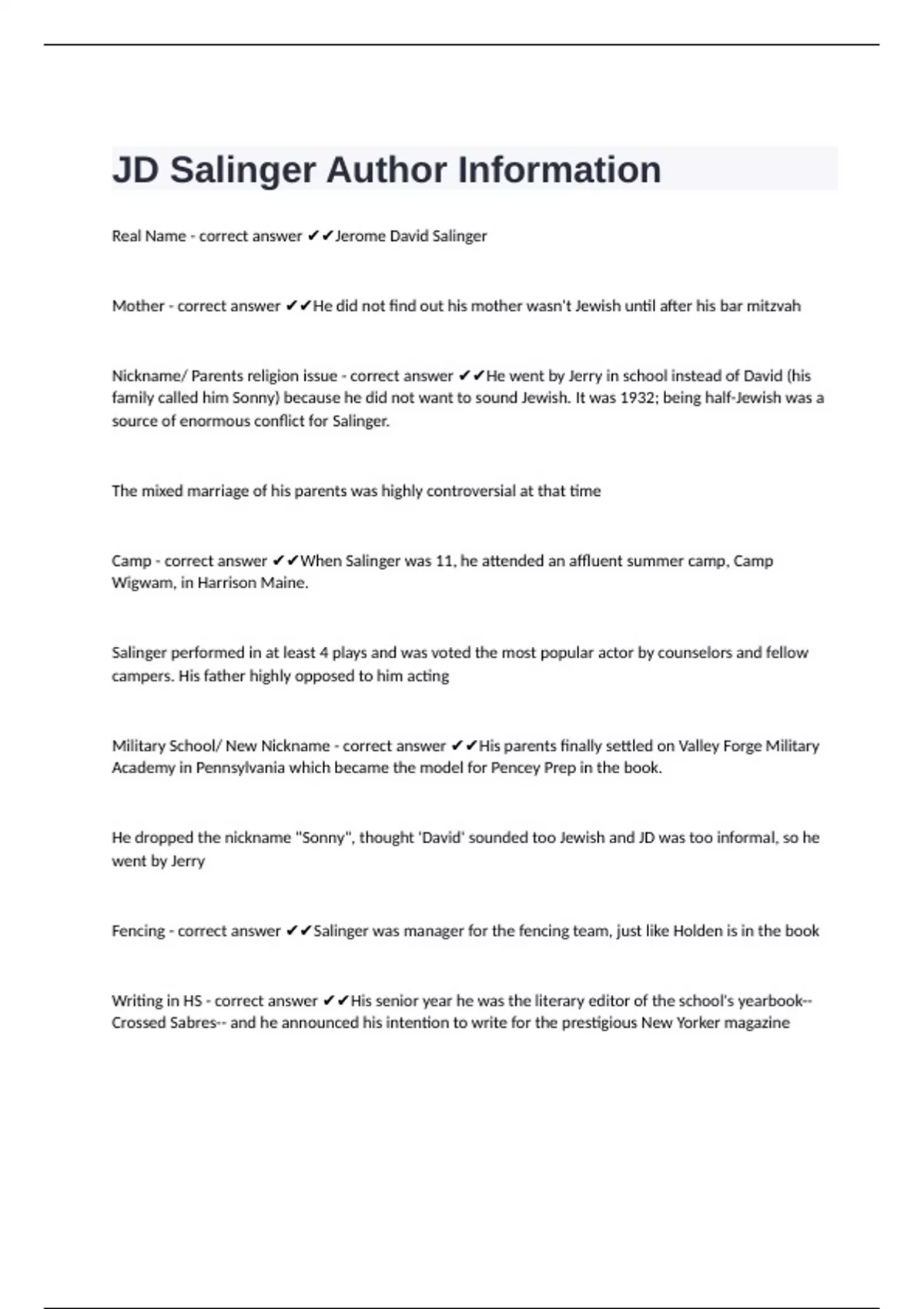 Fencing - correct answer ✔✔Salinger was manager for the fencing team, just like Holden is in the book