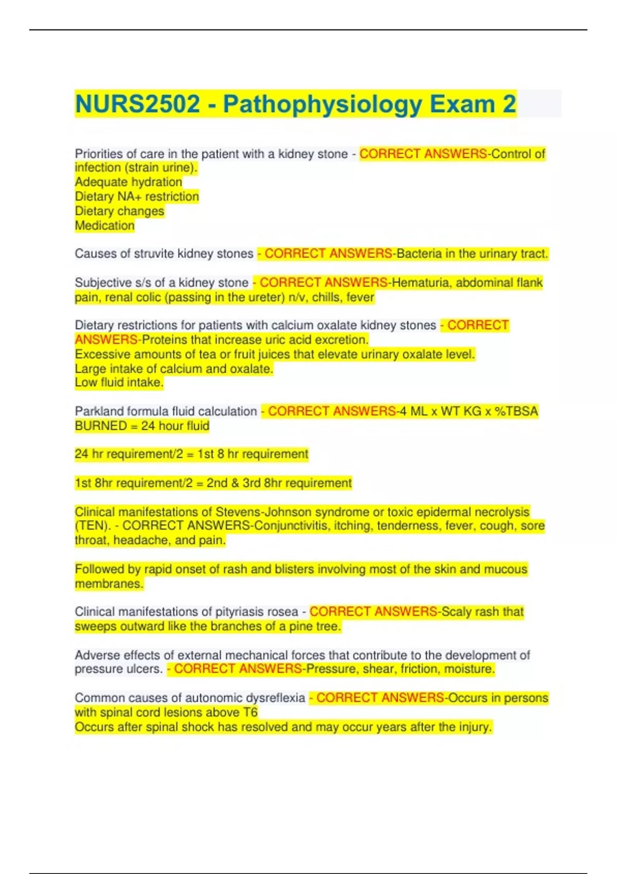 NURS2502 - Pathophysiology Exam 2 Priorities of care in the patient with a kidney stone - CORRECT ANSWERS-Control of infection (strain urine). Adequate hydration Dietary NA+ restriction Dietary changes Medication Causes of struvite kidney stones - CORRECT ANSWERS-Bacteria in the urinary tract. Subjective s/s of a kidney stone - CORRECT ANSWERS-Hematuria, abdominal flank pain, renal colic (passing in the ureter) n/v, chills, fever Dietary restrictions for patients with calcium oxalate kidney stones - CORRECT ANSWERS-Proteins that increase uric acid excretion. Excessive amounts of tea or fruit juices that elevate urinary oxalate level. Large intake of calcium and oxalate. Low fluid intake. Parkland formula fluid calculation - CORRECT ANSWERS-4 ML x WT KG x %TBSA BURNED = 24 hour fluid 24 hr requirement/2 = 1st 8 hr requirement 1st 8hr requirement/2 = 2nd & 3rd 8hr requirement Clinical manifestations of Stevens-Johnson syndrome or toxic epidermal necrolysis (TEN). - CORRECT ANSWERS-Conjunctivitis, itching, tenderness, fever, cough, sore throat, headache, and pain. Followed by rapid onset of rash and blisters involving most of the skin and mucous membranes. Clinical manifestations of pityriasis rosea - CORRECT ANSWERS-Scaly rash that sweeps outward like the branches of a pine tree. Adverse effects of external mechanical forces that contribute to the development of pressure ulcers. - CORRECT ANSWERS-Pressure, shear, friction, moisture. Common causes of autonomic dysreflexia - CORRECT ANSWERS-Occurs in persons with spinal cord lesions above T6 Occurs after spinal shock has resolved and may occur years after the injury. Clinical manifestations of a Brown-Sequard spinal cord injury - CORRECT ANSWERS-Loss of motor function, proprioception, and vibration sense on side of injury, loss of pain and temperature opposite side of injury. S/s of neurogenic shock - CORRECT ANSWERS-BP HR Cardiac Output decrease, venous pooling, paralyzed portions of the body don't sweat. Clinical manifestations immediately noted after complete spinal cord injury - CORRECT ANSWERS-Loss of all motor and sensory function below the level of the injury Bilateral external rotation of the legs Loss of bowel and bladder function May develop spinal or neurogenic shock Priority nursing diagnosis for a patient with a spinal cord injury. - CORRECT ANSWERS-ABCs (Airway, Breathing, Circulation) and mobility HIV Viral loads - CORRECT ANSWERS-High: greater than or equal to 100,000 copies/mL Low: greater than or equal to 10,000 copies/mL. Undetectable = less than 500 or 50 copies/mL, depending on the test used. Response to antiretroviral medications - CORRECT ANSWERS-Used to decrease viral load. Prevention of transmission of the HIV virus to the baby after birth. - CORRECT ANSWERS-Bottle feeding instead of breastfeeding. Role of reverse transcriptase - CORRECT ANSWERS-Assists to make a single viral DNA and it copies itself to make a double-stranded viral DNA Diagnostic criteria for AIDS - CORRECT ANSWERS-Screening tests detect HIV-specific antibodies (up to 2 months before antibodies can be detected). Progression monitored by CD4+ T cell counts. Lab tests measuring viral activity (Assess disease progression, viral load). Clinical manifestations of pneumonia in the elderly. - CORRECT ANSWERS-Altered LOC and dehydration Criteria for positive PPD test. - CORRECT ANSWERS->5: w/pt's with HIV. >10: healthcare workers, drug users, under served population >15: general public anything greater than test numbers is positive (good), negative is bad. Lab findings in the patient with pneumonia. - CORRECT ANSWERS-Elevated WBCs