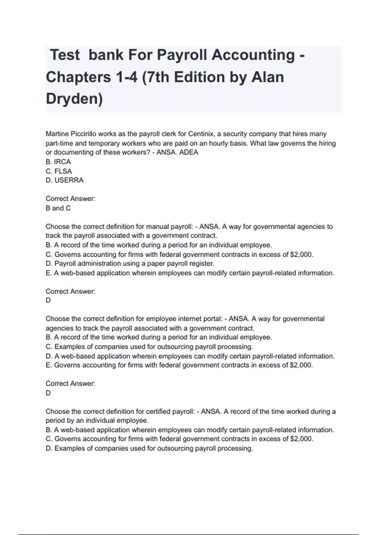 Test bank For Payroll Accounting - Chapters 1-4 (7th Edition by Alan Dryden)