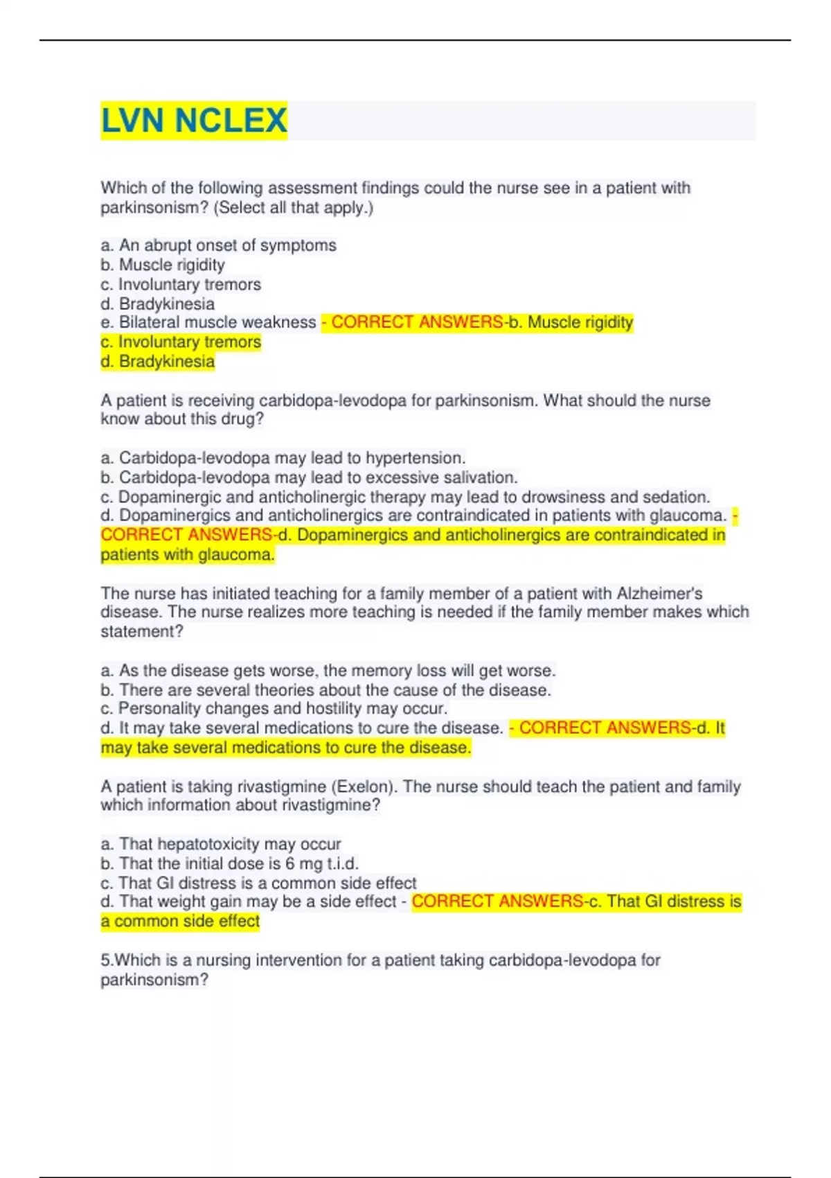 LVN NCLEX Which of the following assessment findings could the nurse see in a patient with parkinsonism? (Select all that apply.) a. An abrupt onset of symptoms b. Muscle rigidity c. Involuntary tremors d. Bradykinesia e. Bilateral muscle weakness - CORRECT ANSWERS-b. Muscle rigidity c. Involuntary tremors d. Bradykinesia A patient is receiving carbidopa-levodopa for parkinsonism. What should the nurse know about this drug? a. Carbidopa-levodopa may lead to hypertension. b. Carbidopa-levodopa may lead to excessive salivation. c. Dopaminergic and anticholinergic therapy may lead to drowsiness and sedation. d. Dopaminergics and anticholinergics are contraindicated in patients with glaucoma. - CORRECT ANSWERS-d. Dopaminergics and anticholinergics are contraindicated in patients with glaucoma. The nurse has initiated teaching for a family member of a patient with Alzheimer's disease. The nurse realizes more teaching is needed if the family member makes which statement? a. As the disease gets worse, the memory loss will get worse. b. There are several theories about the cause of the disease. c. Personality changes and hostility may occur. d. It may take several medications to cure the disease. - CORRECT ANSWERS-d. It may take several medications to cure the disease. A patient is taking rivastigmine (Exelon). The nurse should teach the patient and family which information about rivastigmine? a. That hepatotoxicity may occur b. That the initial dose is 6 mg t.i.d. c. That GI distress is a common side effect d. That weight gain may be a side effect - CORRECT ANSWERS-c. That GI distress is a common side effect 5.Which is a nursing intervention for a patient taking carbidopa-levodopa for parkinsonism? a. Encourage the patient to adhere to a high-protein diet. b. Inform the patient that perspiration may be dark and stain clothing. c. Advise the patient that glucose levels should be checked with urine testing. d. Warn the patient that it may take 4 to 5 days before symptoms are controlled. - CORRECT ANSWERS-b. Inform the patient that perspiration may be dark and stain clothing. What would the nurse teach a patient who is taking anticholinergic therapy for parkinsonism? (Select all that apply.) a. Avoid alcohol, cigarettes, and caffeine. b. Relieve dry mouth with hard candy or ice chips. c. Use sunglasses to reduce photophobia. d. Urinate 2 hours after taking the drug. e. Receive routine eye examinations. - CORRECT ANSWERS-a. Avoid alcohol, cigarettes, and caffeine. A patient is taking rivastigmine (Exelon) to improve cognitive function. What should the nurse teach the patient/family member to do? (Select all that apply.) a. Rise slowly to avoid dizziness. b. Remove obstacles from pathways to avoid injury. c. Closely follow the drug dosing schedule. d. Have frequent checks for hypertension. e. Receive regular liver function tests. - CORRECT ANSWERS-a. Rise slowly to avoid dizziness. b. Remove obstacles from pathways to avoid injury. c. Closely follow the drug dosing schedule. Your client has a fracture of the radius. There is swelling at the injury site and the client complains of pain in the area. Which stage of bone healing do these signs and symptoms represent? a. Cellular proliferation b. Inflammatory c. Ossification d. Callus formation - CORRECT ANSWERS-b. Inflammatory During the inflammatory phase, bleeding occurs at the area of injury and results in a hematoma. Why plus I was rushed to the area of injury to begin to debride the dead cells. The patient will experience pain during this phase. Cellular proliferation occurs after approximately 5 days, when the interrupted blood supply is recreated and fibrin strands begin to form. The callus formation stage takes about 3 to 4 weeks, while the ossification stage may take as long as 3 to 4 months. Remodeling of the bone may take months to years.