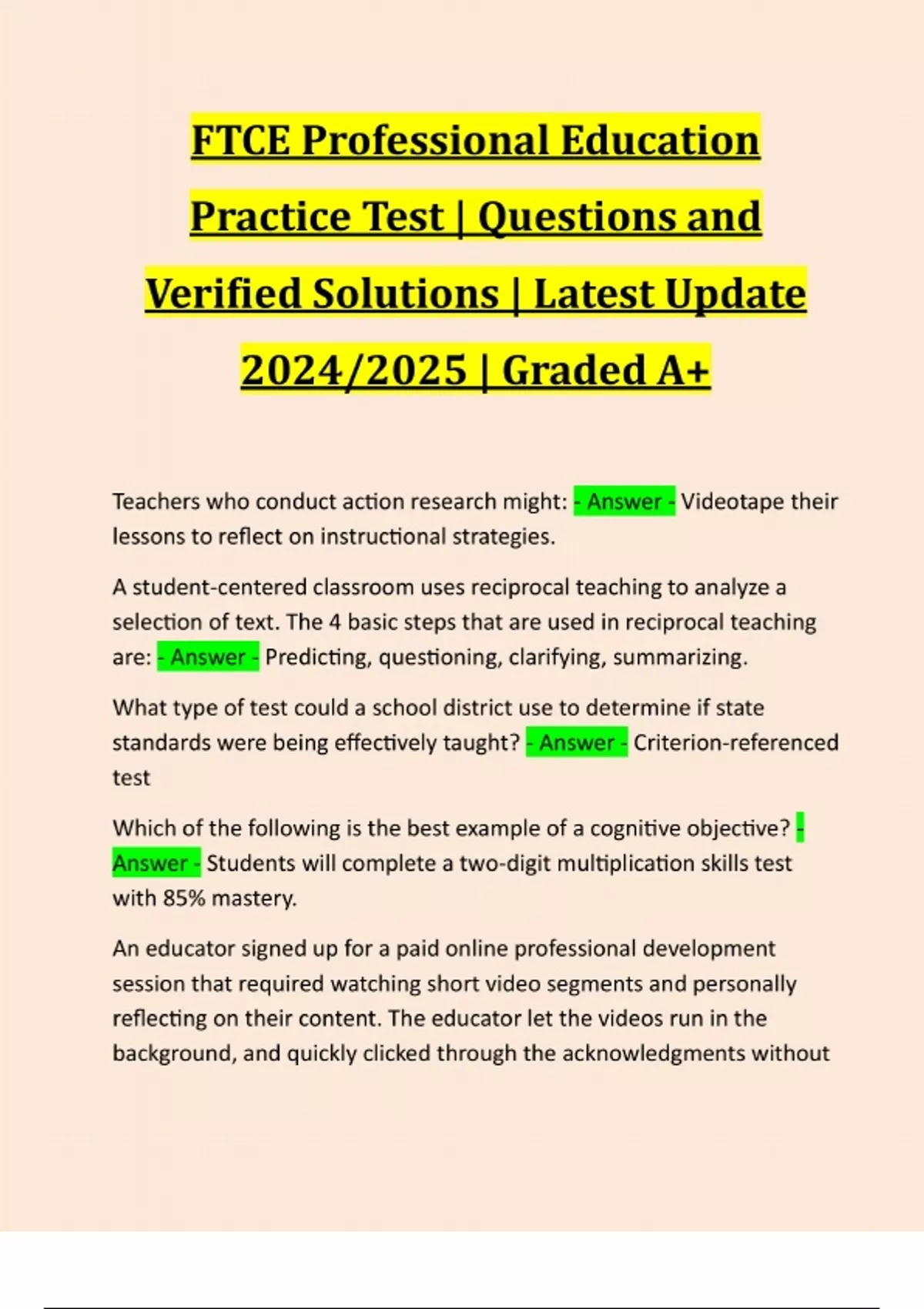 FTCE Professional Education Practice Test | Questions and Verified Solutions | Latest Update 2024/2025 | Graded A+ Teachers who conduct action research might: - Answer - Videotape their lessons to reflect on instructional strategies. A student-centered classroom uses reciprocal teaching to analyze a selection of text. The 4 basic steps that are used in reciprocal teaching are: - Answer - Predicting, questioning, clarifying, summarizing. What type of test could a school district use to determine if state standards were being effectively taught? - Answer - Criterion-referenced test Which of the following is the best example of a cognitive objective? - Answer - Students will complete a two-digit multiplication skills test with 85% mastery. An educator signed up for a paid online professional development session that required watching short video segments and personally reflecting on their content. The educator let the videos run in the background, and quickly clicked through the acknowledgments withoutcompleting the reflections. What portion of the Code of Ethics does this violate? - Answer - The obligation to the profession. Learning activities should always be based on: - Answer - specific objectives. An elementary reading teacher wants to get parents reading nightly with their children. The most effective way to do this while fostering parent communication is to: - Answer - Invit