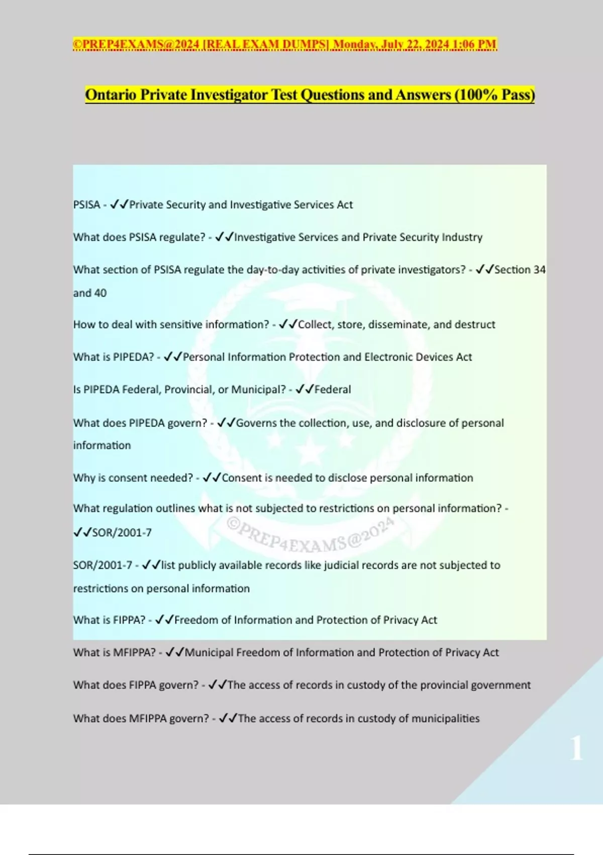 Ontario Private Investigator Test Questions and Answers (100% Pass)
