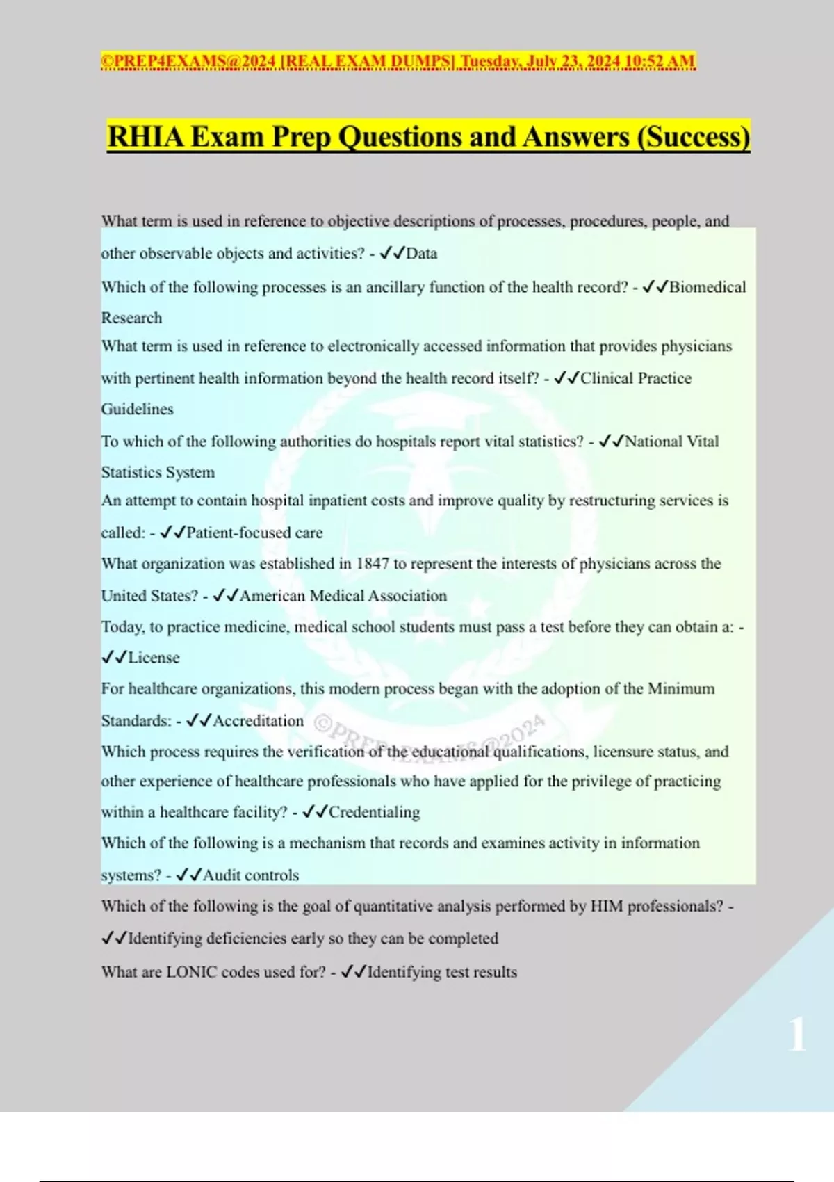 RHIA Exam Prep Questions and Answers (Success)