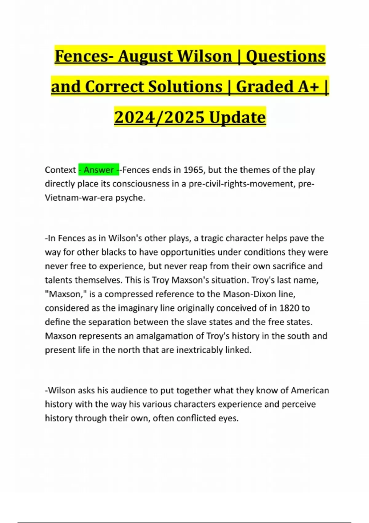 Fences- August Wilson | Questions and Correct Solutions | Graded A+ | 2024/2025 Update Context - Answer --Fences ends in 1965, but the themes of the play directly place its consciousness in a pre-civil-rights-movement, preVietnam-war-era psyche. -In Fences as in Wilson's other plays, a tragic character helps pave the way for other blacks to have opportunities under conditions they were never free to experience, but never reap from their own sacrifice and talents themselves. This is Troy Maxson's situation. Troy's last name, "Maxson," is a compressed reference to the Mason-Dixon line, considered as the imaginary line originally conceived of in 1820 to define the separation between the slave states and the free states. Maxson represents an amalgamation of Troy's history in the south and present life in the north that are inextricably linked. -Wilson asks his audience to put together what they know of American history with the way his various characters experience and perceive history through their own, often conflicted eyes.-The Pittsburgh of the Maxson family is a town where Troy and other men of his generation fled from the savage conditions of sharecropping in the south. After Reconstruction failed, many blacks walked north as far as they could go to become urban citizens. Having no resources or infrastructure to depend on, men like Bono and Troy found their way in the world by spending years living in shacks, stealing, and in jail. -Published: 1986
