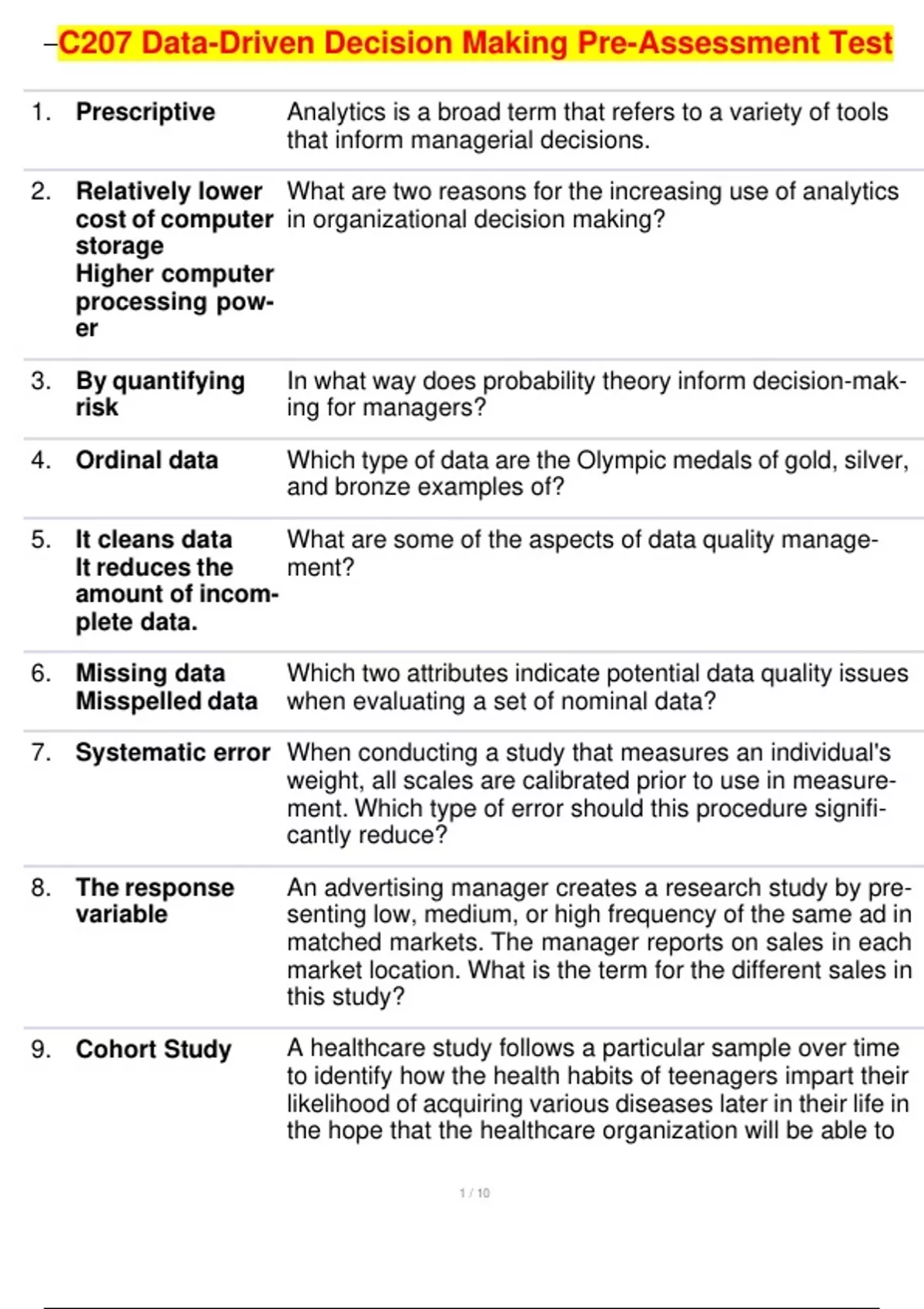 C207 Data-Driven Decision Making Pre-Assessment Test 1. Prescriptive 2. Relatively lower cost of computer storage Higher computer processing pow- er 3. By quantifying risk 4. Ordinal data 5. It cleans data It reduces the amount of incom- plete data. 6. Missing data Misspelled data 7. Systematic error 8. The response variable 9. Cohort Study Analytics is a broad term that refers to a variety of tools that inform managerial decisions. What are two reasons for the increasing use of analytics in organizational decision making? In what way does probability theory inform decision-mak- ing for managers? Which type of data are the Olympic medals of gold, silver, and bronze examples of? What are some of the aspects of data quality manage- ment? Which two attributes indicate potential da