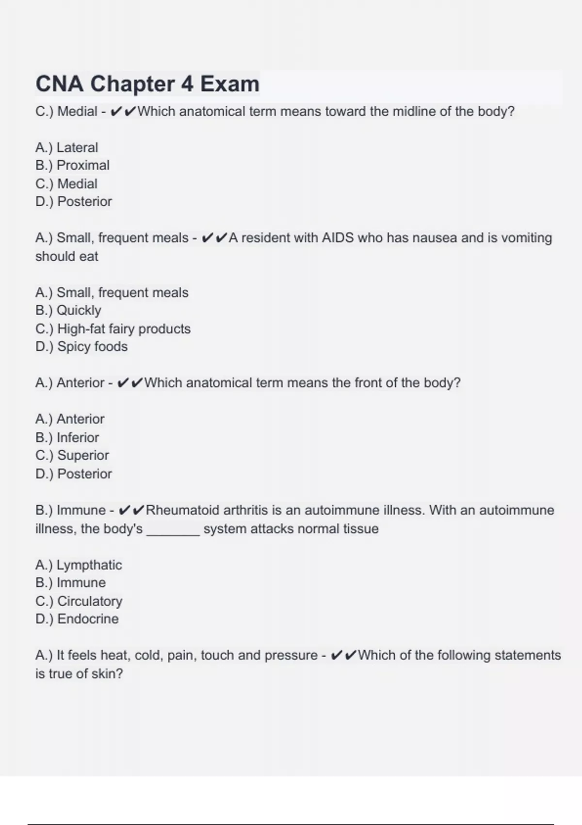 C.) Medial - ✔✔Which anatomical term means toward the midline of the body?