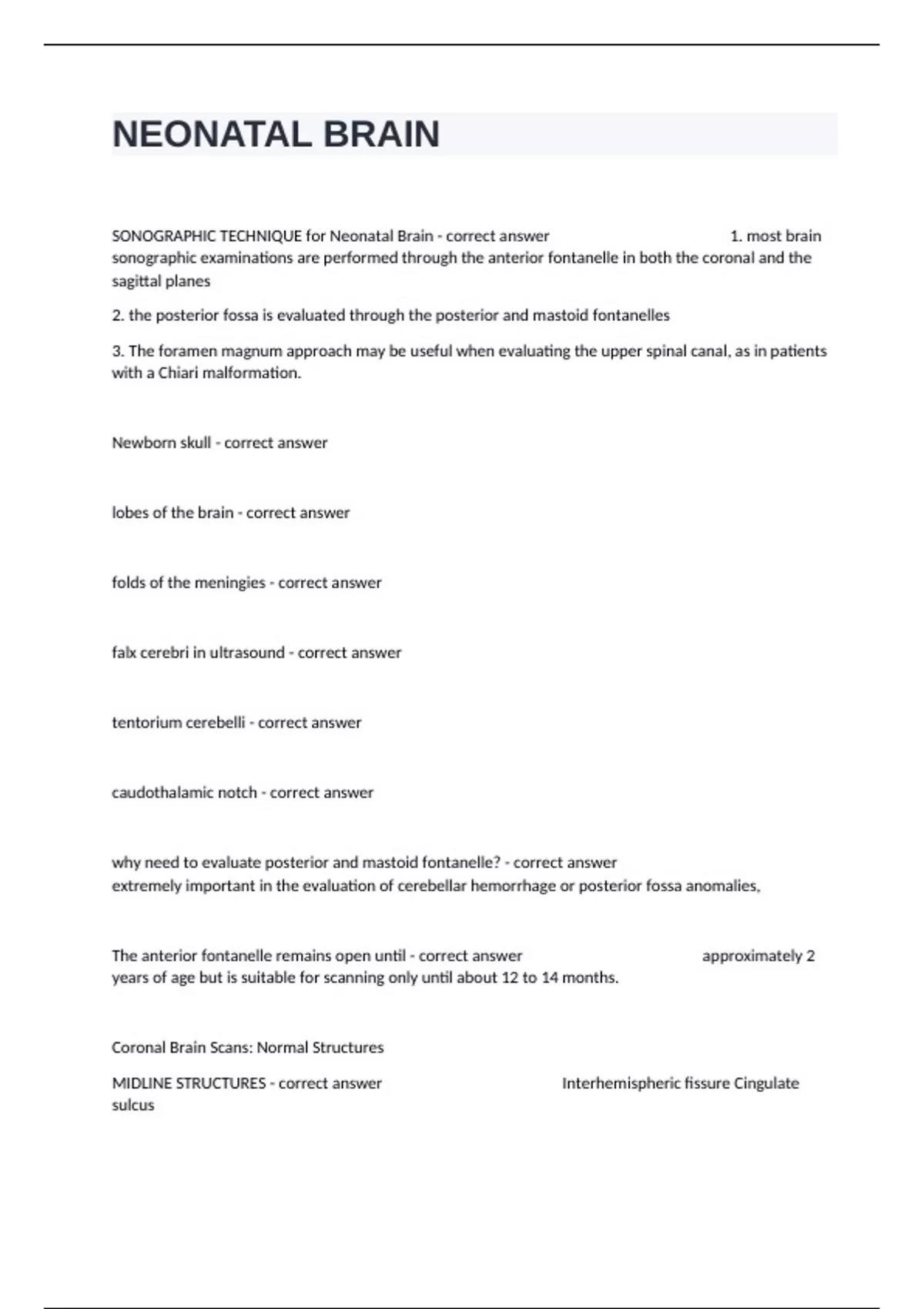 SONOGRAPHIC TECHNIQUE for Neonatal Brain - correct answer 1. most brain