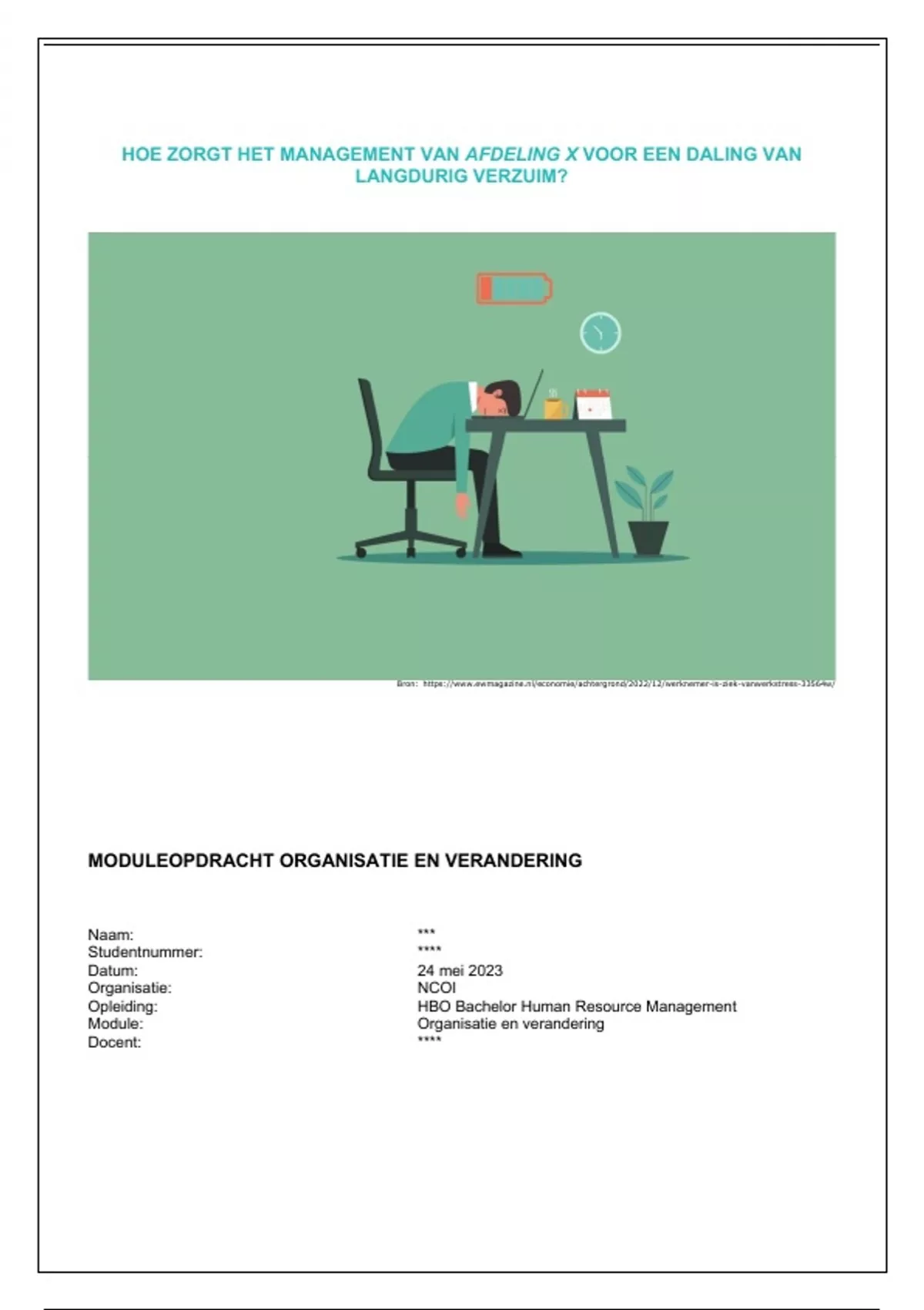 ****. De aanleiding voor het schrijven van een veranderaanpak is het oplopende verzuimpercentage van de