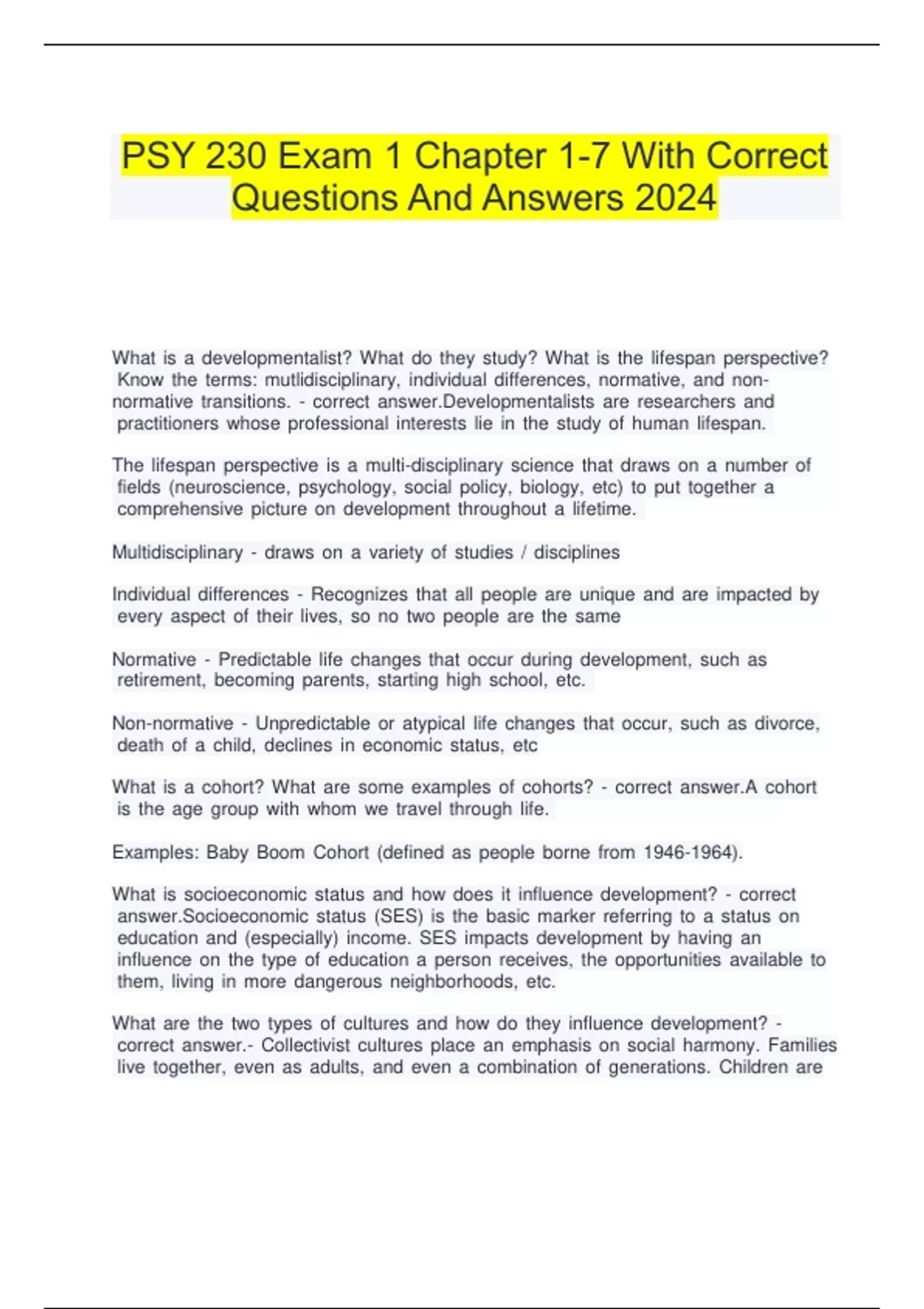 PSY 230 Exam 1 Chapter 1-7 With Correct