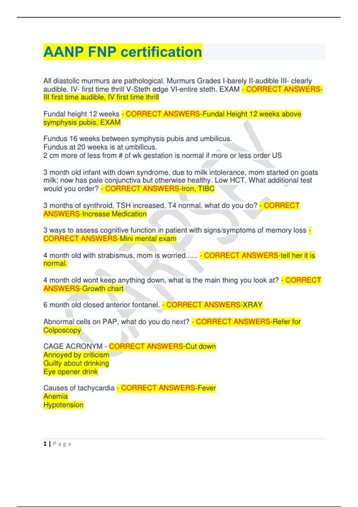 AANP FNP certification All diastolic murmurs are pathological. Murmurs Grades I-barely II-audible III- clearly audible. IV- first time thrill V-Steth edge VI-entire steth. EXAM - CORRECT ANSWERS-III first time audible, IV first time thrill Fundal height 12 weeks - CORRECT ANSWERS-Fundal Height 12 weeks above symphysis pubis. EXAM Fundus 16 weeks between symphysis pubis and umbilicus. Fundus at 20 weeks is at umbilicus. 2 cm more of less from # of wk gestation is normal if more or less order US 3 month old infant with down syndrome, due to milk intolerance, mom started on goats milk; now has pale conjunctiva but otherwise healthy. Low HCT. What additional test would you order? - CORRECT ANSWERS-Iron, TIBC 3 months of synthroid, TSH increased, T4 normal, what do you do? - CORRECT ANSWERS-Increase Medication 3 ways to assess cognitive function in patient with signs/symptoms of memory loss - CORRECT ANSWERS-Mini mental exam 4 month old with strabismus, mom is worried...... - CORRECT ANSWERS-tell her it is normal. 4 month old wont keep anything down, what is the main thing you look at? - CORRECT ANSWERS-Growth chart 6 month old closed anterior fontanel. - CORRECT ANSWERS-XRAY Abnormal cells on PAP, what do you do next? - CORRECT ANSWERS-Refer for Colposcopy CAGE ACRONYM - CORRECT ANSWERS-Cut down Annoyed by criticism Guilty about drinking Eye opener drink Causes of tachycardia - CORRECT ANSWERS-Fever Anemia Hypotension 2 | P a g e Cranial nerves responsible for extraocular eye movements - CORRECT ANSWERS-CN 3,4,6 Definition of metabolic syndrome - CORRECT ANSWERS-cluster of conditions that increase risk of heart disease, stroke, diabetes. diagnose trichomoniasis - CORRECT ANSWERS-wet prep Elderly presents with atrophic vaginitis, small uterus, palpable 4x5 ovary, what do you do next? - CORRECT ANSWERS-Pelvic US Epistaxis is most common in the area of the nose known as kiesselbachs triangle, where is this located? - CORRECT ANSWERS-Anterior septum Definitive diagnosis of acute bacterial prostatitis - CORRECT ANSWERS-urinalysis and culture GERD treatment - CORRECT ANSWERS-H2 is first line, give hs Grade 3 cells on Pap, treatment? - CORRECT ANSWERS-LEEP excision Fingernail hematoma treatment? - CORRECT ANSWERS-drill hole and drain blood? Increased risk of ectopic pregnancy - CORRECT ANSWERS-Salpingitis, or history of abortion, PID, Koplick spots - CORRECT ANSWERS-Measles (rubeola). Grains of salt lesions inside mouth in Measles Koplick spots - CORRECT ANSWERS-Measles (rubeola). Grains of salt lesions inside mouth in Measles Legg-Calve-Perthes Disease - CORRECT ANSWERS-Avascular necrosis of the proximal femoral head Lipid level of 1500, increased risk for? - CORRECT ANSWERS-Pancreatitis Low HGB, Low HCT, High MCV indicates what? - CORRECT ANSWERS-Macrocytic anemia, B12 Def Man with BPH, prostate feels on digital exam? - CORRECT ANSWERS-Enlarged, symmetrical, smooth Man with HTN, CAD, present femoral pulses but absent pedal - CORRECT ANSWERS-Arterial Insufficiency
