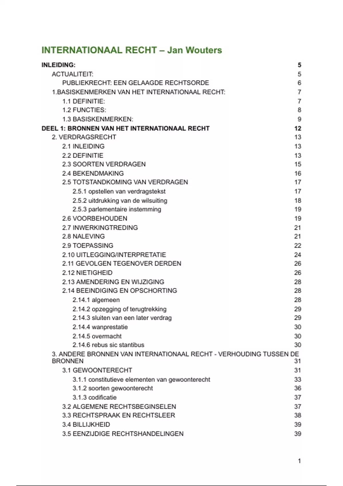 Deze uitgebreide samenvatting van het vak Internationaal Recht aan de KU Leuven is gebaseerd op de lesnotities van twee studenten, aangevuld met gedetailleerde informatie uit de slides van de colleges en het boek 'Internationaal Recht in Kort Bestek' (3e editie). Het vak werd gedoceerd door professor Jan Wouters. Beide studenten slaagden met deze samenvatting in eerste zit :)