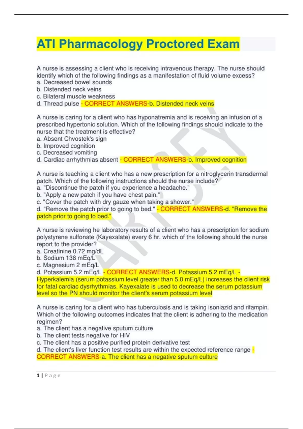 ATI Pharmacology Proctored Exam A nurse is assessing a client who is receiving intravenous therapy. The nurse should identify which of the following findings as a manifestation of fluid volume excess? a. Decreased bowel sounds b. Distended neck veins c. Bilateral muscle weakness d. Thread pulse - CORRECT ANSWERS-b. Distended neck veins A nurse is caring for a client who has hyponatremia and is receiving an infusion of a prescribed hypertonic solution. Which of the following findings should indicate to the nurse that the treatment is effective? a. Absent Chvostek's sign b. Improved cognition c. Decreased vomiting d. Cardiac arrhythmias absent - CORRECT ANSWERS-b. Improved cognition A nurse is teaching a client who has a new prescription for a nitroglycerin transdermal patch. Which of the following instructions should the nurse include? a. "Discontinue the patch if you experience a headache." b. "Apply a new patch if you have chest pain." c. "Cover the patch with dry gauze when taking a shower." d. "Remove the patch prior to going to bed." - CORRECT ANSWERS-d. "Remove the patch prior to going to bed." A nurse is reviewing he laboratory results of a client who has a prescription for sodium polystyrene sulfonate (Kayexalate) every 6 hr. which of the following should the nurse report to the provider? a. Creatinine 0.72 mg/dL b. Sodium 138 mEq/L c. Magnesium 2 mEq/L d. Potassium 5.2 mEq/L - CORRECT ANSWERS-d. Potassium 5.2 mEq/L - Hyperkalemia (serum potassium level greater than 5.0 mEq/L) increases the client risk for fatal cardiac dysrhythmias. Kayexalate is used to decrease the serum potassium level so the PN should monitor the client's serum potassium level A nurse is caring for a client who has tuberculosis and is taking isoniazid and rifampin. Which of the following outcomes indicates that the client is adhering to the medication regimen? a. The client has a negative sputum culture b. The client tests negative for HIV c. The client has a positive purified protein derivative test d. The client's liver function test results are within the expected reference range - CORRECT ANSWERS-a. The client has a negative sputum culture 2 | P a g e A client is caring for a client who develops an anaphylactic reaction to IV administration. After assessing the client's respiratory status and stopping the medication infusion. Which of the following actions should the nurse take next? a. Replace the infusion with 0.9% sodium chloride b. Give diphenhydramine IM c. Elevate the client's legs and feet d. Administer epinephrine IM - CORRECT ANSWERS-d. Administer epinephrine IM A nurse is caring for a client who is taking sertraline and reports a desire to begin taking supplements. Which of the following supplements should the nurse advise the client to avoid? a. St. John's Wort b. Ginger root c. Black cohosh d. Coenzyme Q10 - CORRECT ANSWERS-a. St. John's Wort A nurse is caring for a client who has heart failure and a new prescription for lisinopril. For which of the following adverse effects should the nurse monitor when administering lisinopril? a. Bradycardia b. Hypokalemia c. Tinnitus d. Hypotension - CORRECT ANSWERS-d. Hypotension A nurse is assessing a client who is receiving heparin IV continuous IV. The client has an PPT of 90 seconds. They should monitor the client for which of the following changes in their vital signs? a. Decreased temperature b. Increased pulse rate c. Decreased respiratory rate d. Increased blood pressure - CORRECT ANSWERS-d. Increased blood pressure A nurse is preparing to administer medication to a client and discovers a medication error. The nurse should recognize that which of the following staff members is responsible for completing an incident report? a. The quality improvement committee b. The nurse who identifies the error c. The nurse who caused the error d. The charge nurse - CORRECT ANSWERS-b. The nurse who identifies the error A nurse is planning care for a client who is receiving morphine via continuous epidural infusion. The nurse should monitor the client for which of the following? a. Pruritus b. Cough c. Tachypnea 3 | P a g e d. Gastric bleeding - CORRECT ANSWERS-a. Pruritus - Sign of allergic reaction to morphine A nurse is preparing to administer digoxin orally to a client. Identify the sequence of steps the nurse should take. (Move the steps into the box on the right placing them in the order of performance. Use all the steps.) - CORRECT ANSWERS-a. Obtain the client's apical heart rate b. Remove the medication from the dispensing system c. Open the medication package d. Compare the client's wristband to the medication administration record e. Document administration of the medication A nurse is reviewing the medical record of an adult client who has a fever and a prescription for acetaminophen. Which of the following findings should the nurse identify as a contraindication for receiving this medication? a. Alcohol use disorder b. Chronic kidney disease c. Hepatitis B vaccine within the last week d. Diabetes mellitus - CORRECT ANSWERS-a. Alcohol use disorder b. Chronic kidney disease A home health nurse is visiting a client who has heart failure and a prescription for furosemide. The nurse identifies that the client has gained 2.5 kg (5 lb.) since the last visit 2 days ago. Which of the following actions should the nurse take first? a. Encourage the client to dangle the legs while sitting in a chair b. Teach the client about foods low in sodium c. Determine medication adherence by the client d. Notify the provider of the client's weight gain - CORRECT ANSWERS-c. Determine medication adherence by the client A nurse is preparing to administer the initial dose of penicillin G IM to a client. The nurse should monitor for which of the following as an indication of an allergic reaction following the injection? a. Urticaria b. Bradycardia c. Pallor d. Dyspepsia - CORRECT ANSWERS-a. Urticaria A nurse is teaching a client who has angina a new prescription for sublingual n