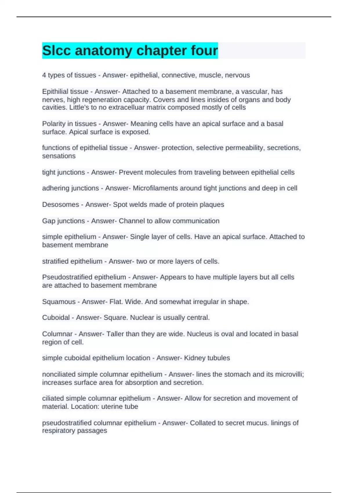simple epithelium - Answer- Single layer of cells. Have an apical surface. Attached to