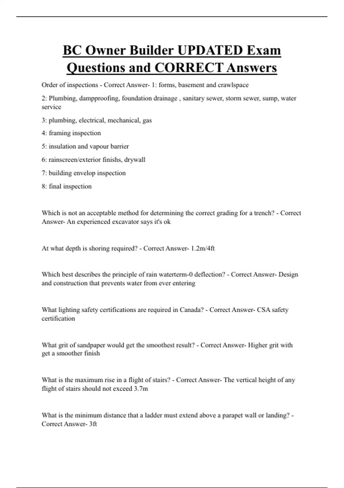 BC Owner Builder UPDATED Exam Questions and CORRECT Answers Order of inspections - Correct Answer- 1: forms, basement and crawlspace 2: Plumbing, dampproofing, foundation drainage , sanitary sewer, storm sewer, sump, water service 3: plumbing, electrical, mechanical, gas 4: framing inspection 5: insulation and vapour barrier 6: rainscreen/exterior finishs, drywall 7: building envelop inspection 8: final inspection Which is not an acceptable method for determining the correct grading for a trench? - Correct Answer- An experienced excavator says it's ok