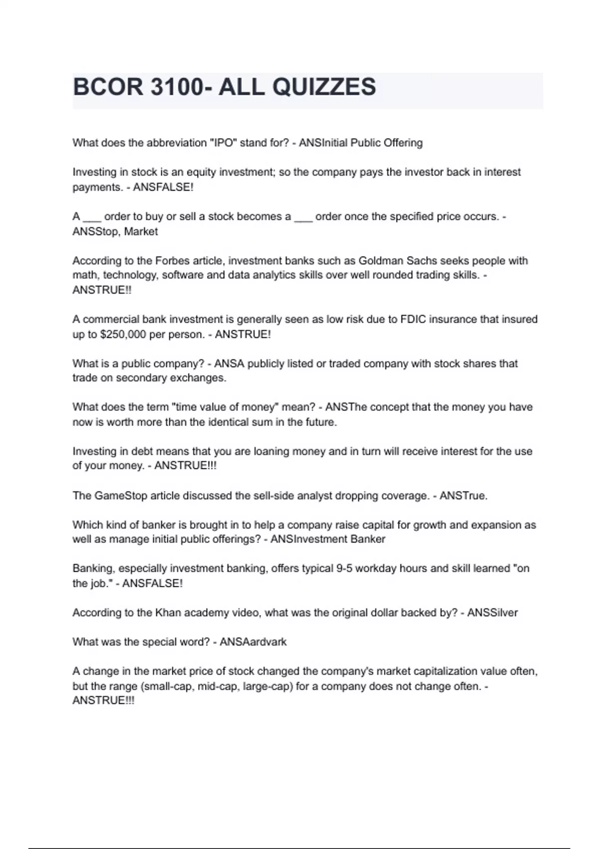 BCOR 3100- ALL QUIZZES and Correct Answers 2024/2025 | Graded A+