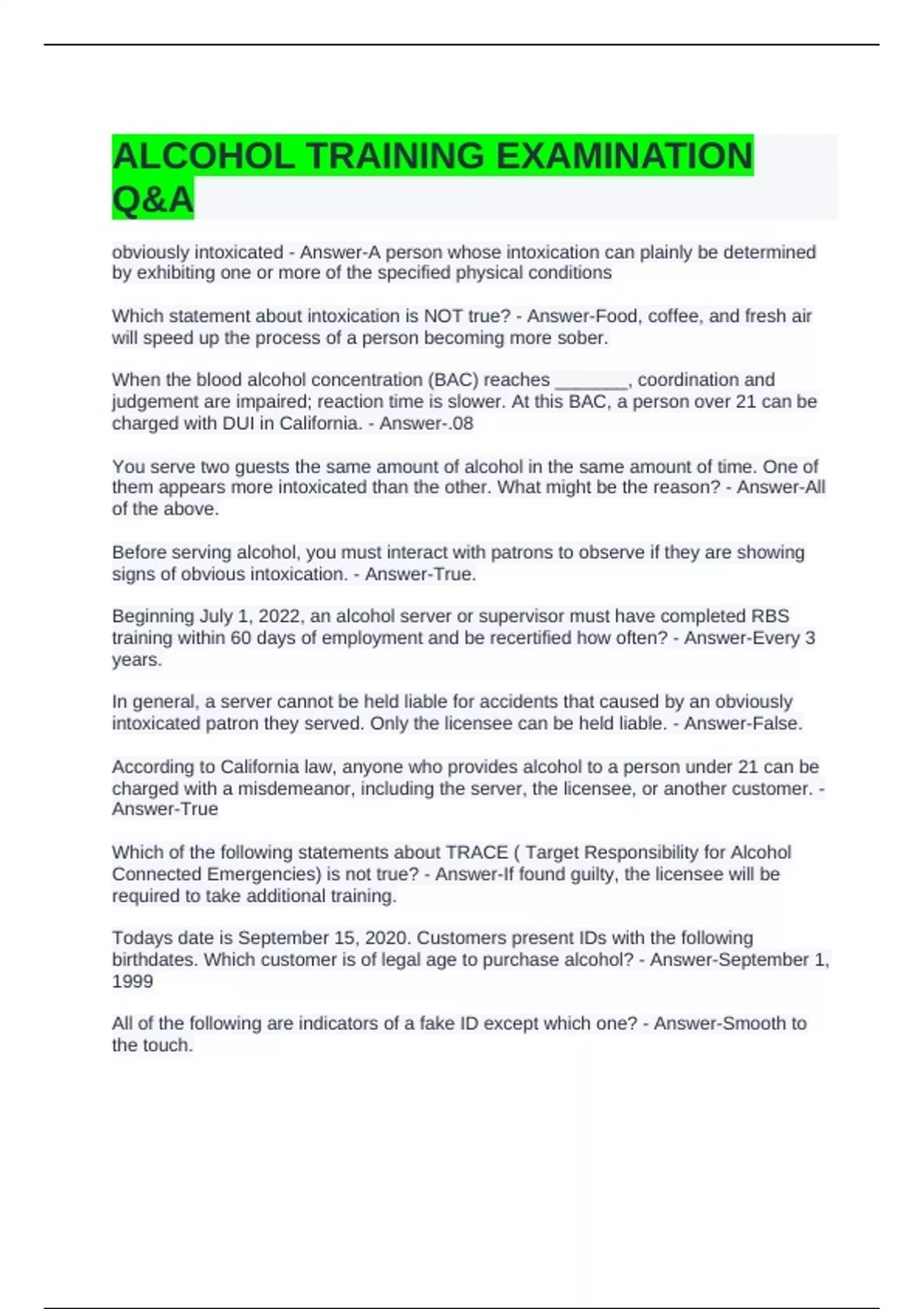 ALCOHOL TRAINING EXAMINATION