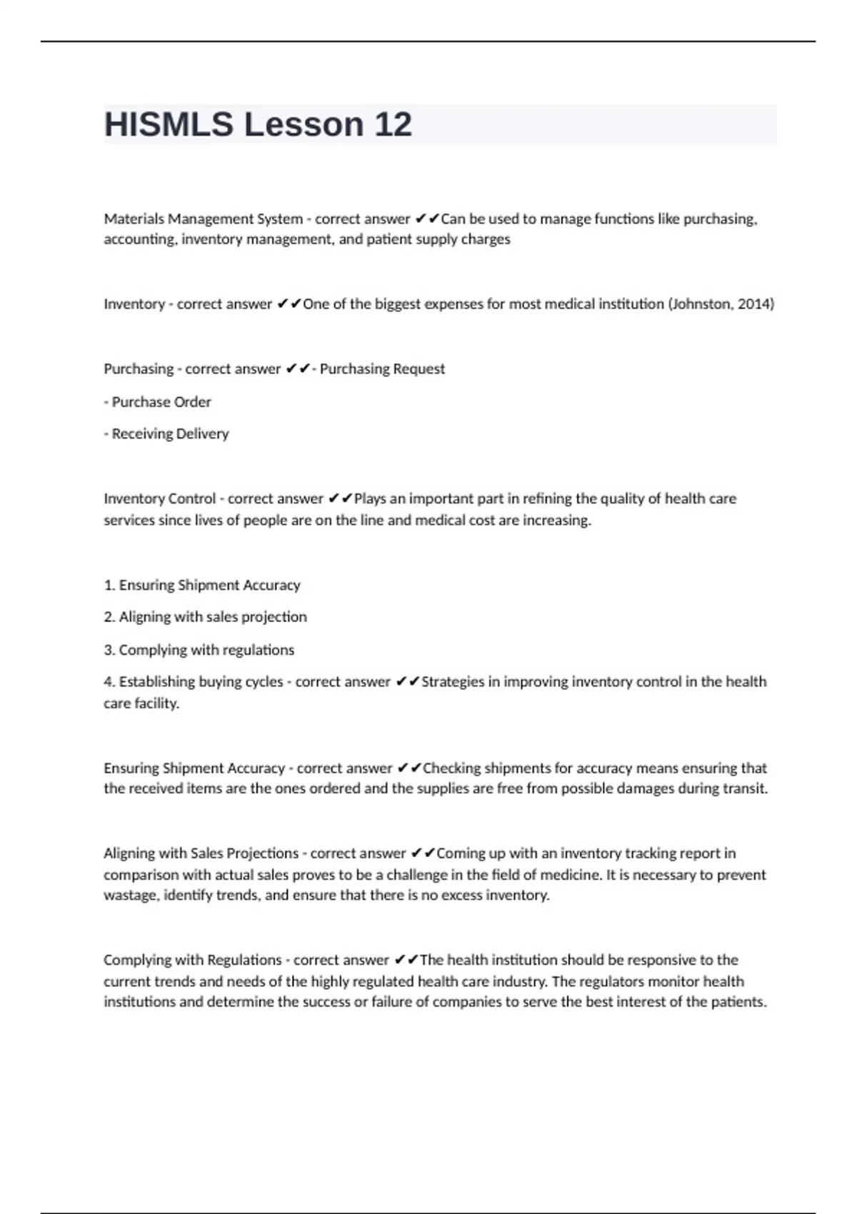 Inventory - correct answer ✔✔One of the biggest expenses for most medical institution (Johnston, 2014)