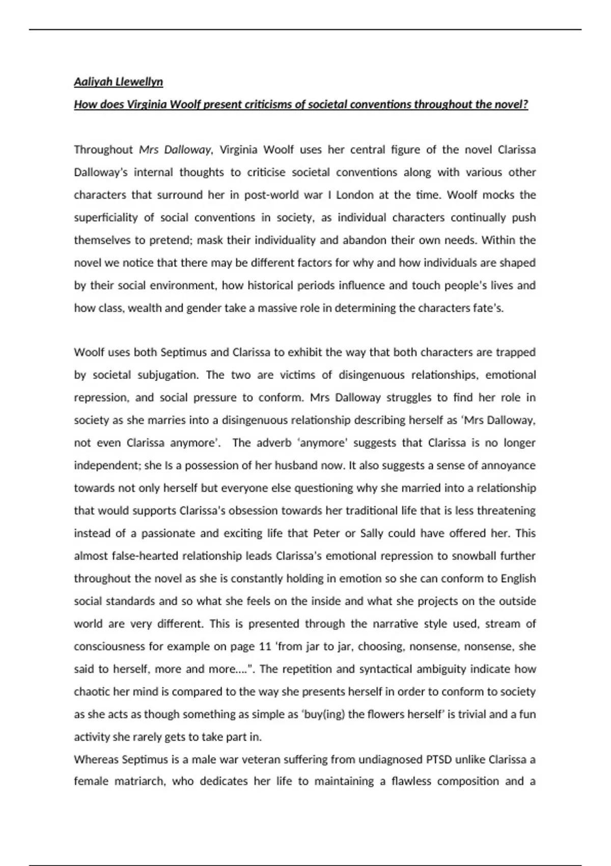 Dalloway’s internal thoughts to criticise societal conventions along with various other