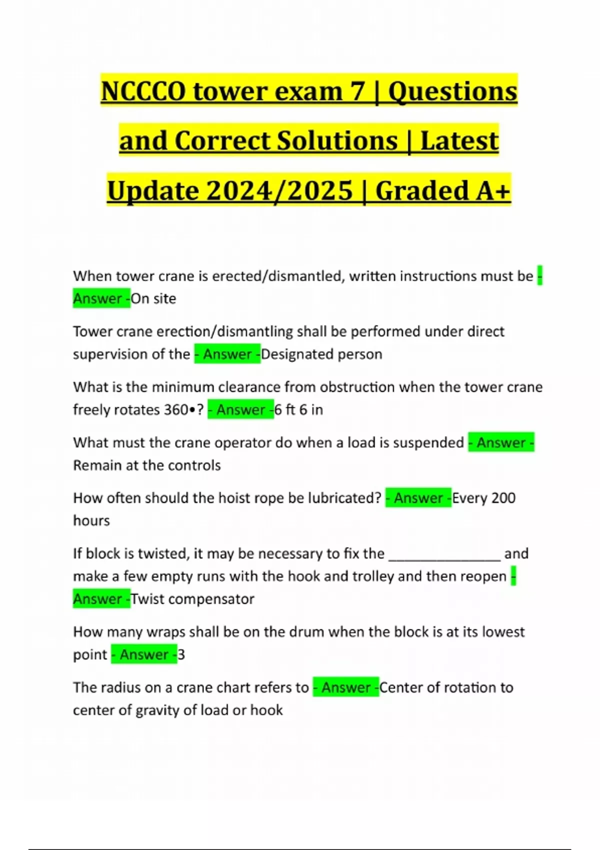 NCCCO tower exam 7 | Questions and Correct Solutions | Latest Update 2024/2025 | Graded A+