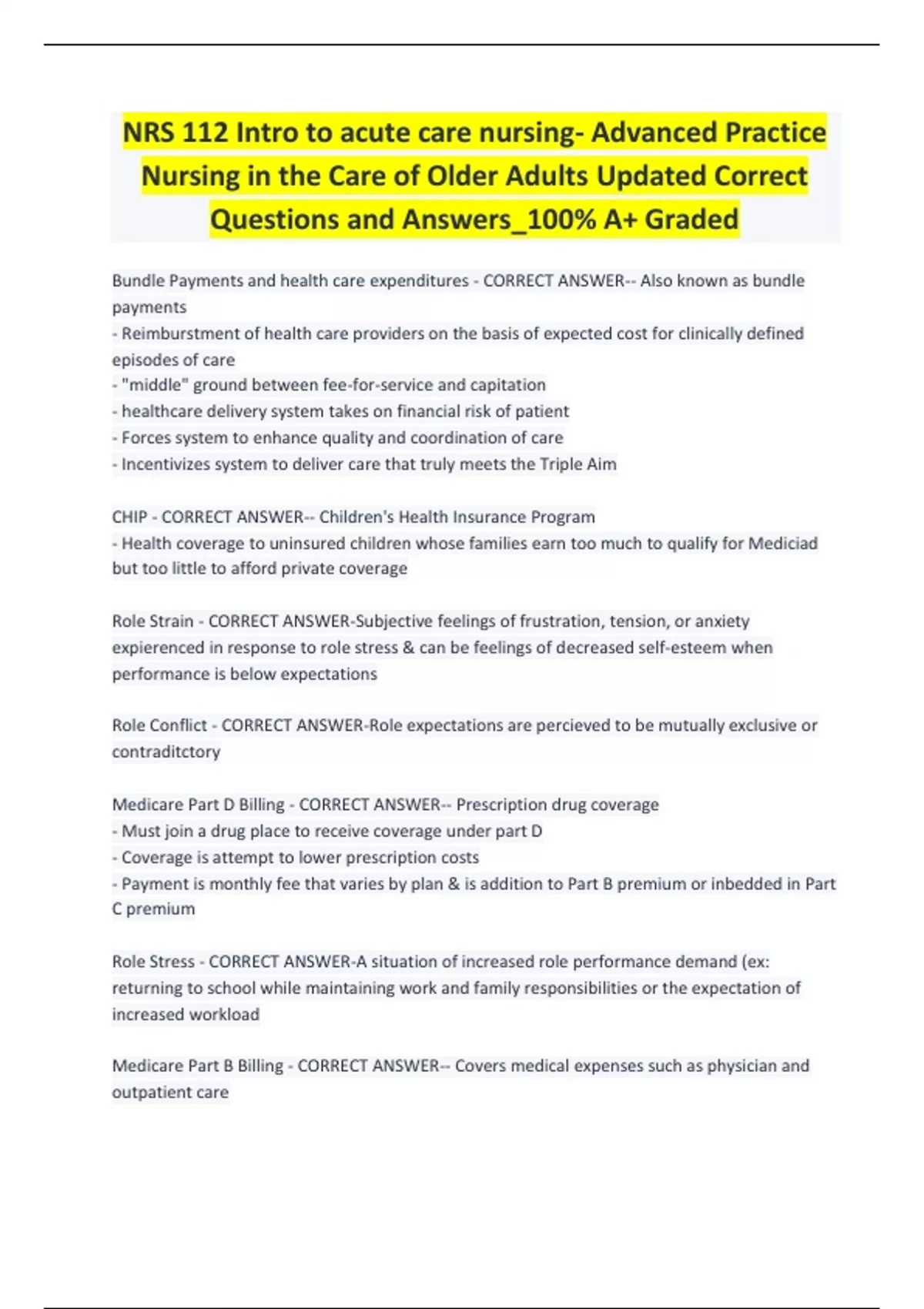 NRS 112 Intro to acute care nursing- Advanced Practice Nursing in the Care of Older Adults Updated Correct Questions and Answers_100% A+ Graded Bundle Payments and health care expenditures - CORRECT ANSWER-- Also known as bundle payments - Reimburstment of health care providers on the basis of expected cost for clinically defined episodes of care - "middle" ground between fee-for-service and capitation - healthcare delivery system takes on financial risk of patient - Forces system to enhance quality and coordination of care - Incentivizes system to deliver care that truly meets the Triple Aim CHIP - CORRECT ANSWER-- Children's Health Insurance Program - Health coverage to uninsured children whose families earn too much to qualify for Mediciad but too little to afford private coverage Role Strain - CORRECT ANSWER-Subjective feelings of frustration, tension, or anxiety expierenced in response to role stress & can be feelings of decreased self-esteem when performance is below expectations Role Conflict - CORRECT ANSWER-Role expectations are percieved to be mutually exclusive or contraditctory Medicare Part D Billing - CORRECT ANSWER-- Prescription drug coverage - Must join a drug place to receive coverage under part D - Coverage is attempt to lower prescription costs - Payment is monthly fee that varies by plan & is addition to Part B premium or inbedded in Part C premium Role Stress - CORRECT ANSWER-A situation of increased role performance demand (ex: returning to school while maintaining work and family responsibilities or the expectation of increased workload Medicare Part B Billing - CORRECT ANSWER-- Covers medical expenses such as physician and outpatient care - Direct reimbursement can only occur when submitting claim through part B - Covers physician and nonphysical provider services, outpatient hospital services, home health care not covered by part A (PT/OT) and other services such as diagnostic testing, durable medical equipment and ambulance costs - Enrollment in part B is voluntary to those receiving Part A - Payment into system via monthly premiums that are established yearly based on system expenses through deductibles & coinsurance programs Advanced Practice Nurse Roles - CORRECT ANSWER-1. Nurse Practitioner 2. Clinical Nurse Specialist 3. Certified Registered Nurse Anesthetist 4. Certified Nurse Midwife Nurse Practition - CORRECT ANSWER-- provide care through diagnosis and treatment as well as addressing disease prevention and health management - 1893 Lillian Wald & Henry Street Settlement (HSS) House - HHS nurses obtained standing orders for emergency medications and treatments - nurses considered "good enough" to care for the poor whereas physicians seen as only careing for those who could pay - FNS/FSA nurse practice centered around the practice autonomy in the requirement that the patients be poor, marginalized and have little access to physician provided medical care - NP role formally described in 1960s and was implemented in outpatient pediatric clinics in response to a shortage of primary care physicians - Loretta Ford in 1965 established first Pediatric NP program (PNP) & was designed to prepare professional nurses to provide comprehensive well-child care and manage common childhood health problems - 1970 continue to enhance visibility in health system, and expand role while demonstrating cost effective quality care - role expanded/included because nurse role was essential to providing equal access to health care for all Americans - conflict surrounds role between other RN and NP and NP and physicians - issues surrounding prescriptive treatment & idaho in 1971 was first state to recognize diagnosis and treatment as part of practice - Support DNP but does not require educational programs to be at the doctoral level Clinical Nurse Specialist - CORRECT ANSWER-- evolved out of increasingly complexity of nursing care - roots in psychiatric nursing - psych specialists date back to 1880 & richards is credited with founding specialty of psych nursing specialists - Rutgers University first educational program for CNS but was for psychiatric nursing - coronary care nurse specialists established in 1962 & CCU nurses blurred invisible boundary separating nursing and medicine - 1960s noted to be when clincal nurse specialist took on modern day form - three social forces drove specialization 1. increase in specialty related information 2. new tech advances 3. response to public need and interests - crtical care and oncology specialty grew in 1970s - ANA recognized CNS role 1970s defining the CNS as an expert practitioner and change agent - master degree required - role has postive effect on improving nursing care and patient outcomes - view shift from direct patient care to education and organizations (seen as too valuable) - education complex due to number of specialties involved - can prescribe without physician supervision in 20 states now - 1997 Balanced Budget Act identified CNS eligible for Medicare reimburstment Certified Registered Nurse Anesthetist - CORRECT ANSWER-- history in civil war - typically anesthesia given only when a physician was unavailable - Dr Mayo first to recognize and formally train CRNA in 1889 -Alice Macaw mother of anesthesia (hired by mayo) - early challenges but practice has grown - 1931 Lakeside hospital establishes National Association of Nurse Anesthetists - LA medical association dues Nelson in 1934 for practicing without a license & nelson won but in response Chalmers-Frances filed another suit and judgement was the result only to have CA Supreme Court rule in favor of Nelson again and the practice of nurse anesthisa was legal/in scope as long as it was done under guidance of supervision of physician - reimburstment not clear cut - mandatory certification - master level education - after 2022 must have a doctoral degree Certified Nurse Midwife - CORRECT ANSWER-- history from start of time - isolated communities rely on midwives - "granny midw