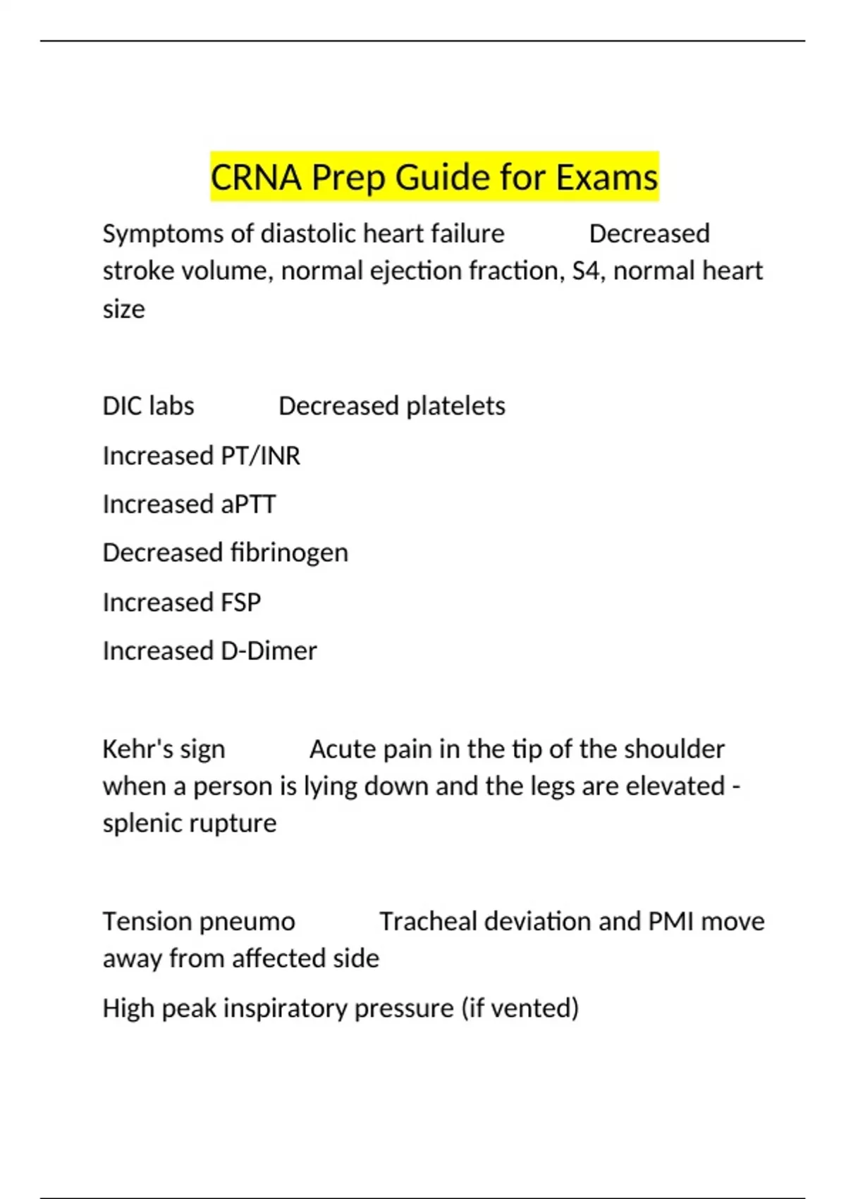 Symptoms of diastolic heart failure ️️ Decreased stroke volume, normal ejection fraction, S4, normal heart size DIC labs ️️ Decreased platelets Increased PT/INR Increased aPTT Decreased fibrinogen Increased FSP Increased D-Dimer Kehr's sign ️️ Acute pain in the tip of the shoulder when a person is lying down and the legs are elevated - splenic rupture Tension pneumo ️️ Tracheal deviation and PMI move away from affected side High peak inspiratory pressure (if vented) Hypotension CPP ️️ MAP-ICP. Normal 60-100 mmHg SS of basilar skull fracture ️️ Racoon eyes, battle sign (black and blue across mastoid (behind ear)), otorrhea (CSF from ears: perform halo test), rhinorrhea (csf from nose: check sugar), lose cranial nerve one (cant smell) bolt placement ️️ subarachoid space and dura mater, becomes less and less reliable over time and can be influenced by external things Etomidate dose ️️ 0.2-0.3 mg/kg Etomidate ️️ used for brief periods of sedation for intubation, dose if 0.3mg/kg IVP, peak= I min, duration of action= 4 to 10 minutes Coumadin ️️ Anticoagulant, most commonly given orally, watch INR levels, antidote: Vitamin K Mannitol ️️ 025g/kg given IV blus 24-6 hrs, used to treat ICP, monitor serum osmolality to prevent dehydration and hypernatremia. Heparin gtt ️️ anticoagulant, prevent thrombin, monitor APPT levels Clonidine ️️ Antihypertensive, centrally acting analgesic, stimulate both alpha and beta adrenergic receptors in the brain to decrease sympathetic outflow from the CNS to decrease BP, HR, renal vascular resistance, and PVR, dose: 0.1-0.2mg Coumadin ️️ Anticoagulant, most commonly given orally, watch INR levels, antidote: Vitamin K Esmolol ️️ a short-acting cardioselective adrenergic receptor blocker used for HTN crisis and SVT, adverse reactions include seizures and bronchospasm Epinephrine receptors ️️ alpha 1, alpha 2, beta 1, beta 2