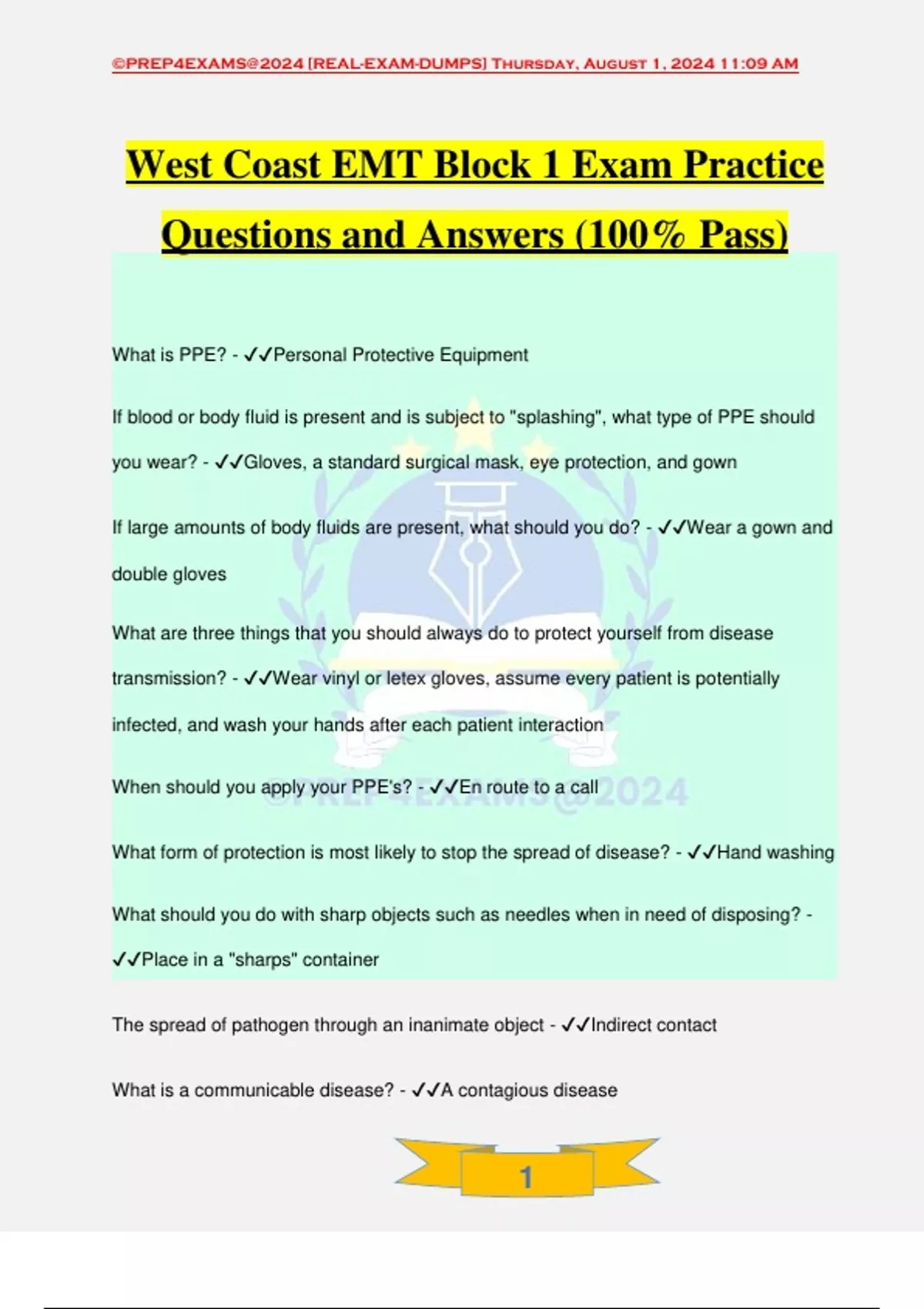 West Coast EMT Block 1 Exam Practice