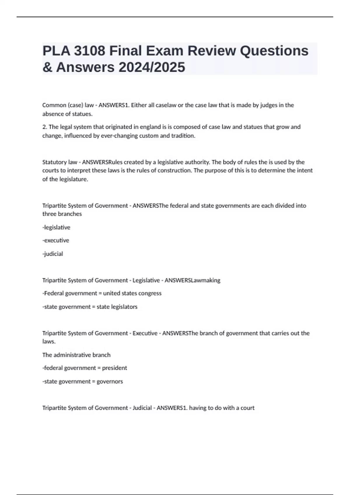 PLA 3108 Final Exam Review Questions & Answers 2024/2025 Common (case) law - ANSWERS1. Either all caselaw or the case law that is made by judges in the absence of statues. 2. The legal system that originated in england is is composed of case law and statues that grow and change, influenced by ever-changing custom and tradition. Statutory law - ANSWERSRules created by a legislative authority. The body of rules the is used by the courts to interpret these laws is the rules of construction. The purpose of this is to determine the intent of the legislature. Tripartite System of Government - ANSWERSThe federal and state governments are each divided into three branches -legislative -executive -judicial Tripartite System of Government - Legislative - ANSWERSLawmaking -Federal government = united states congress -state government = state legislators Tripartite System of Government - Executive - ANSWERSThe branch of government that carries out the laws. The administrative branch -federal government = president -state government = governors Tripartite System of Government - Judicial - ANSWERS1. having to do with a court