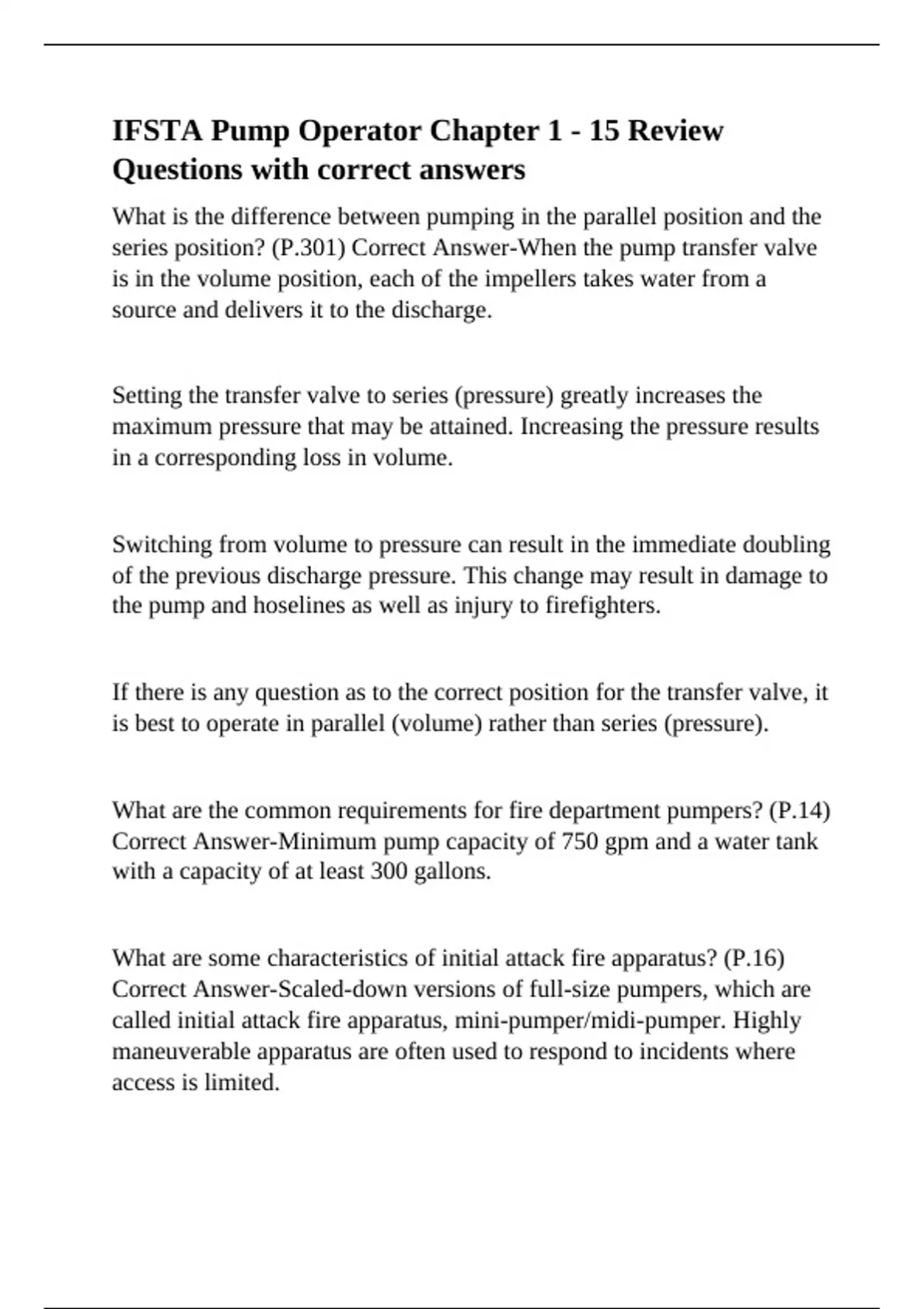 What is the difference between pumping in the parallel position and the series position? (P.301) Correct Answer-When the pump transfer valve is in the volume position, each of the impellers takes water from a source and delivers it to the discharge. Setting the transfer valve to series (pressure) greatly increases the maximum pressure that may be attained. Increasing the pressure results in a corresponding loss in volume. Switching from volume to pressure can result in the immediate doubling of the previous discharge pressure. This change may result in damage to the pump and hoselines as well as injury to firefighters. If there is any question as to the correct position for the transfer valve, it is best to operate in parallel (volume) rather than series (pressure). What are the common requirements for fire department pumpers? (P.14) Correct Answer-Minimum pump capacity of 750 gpm and a water tank with a capacity of at least 300 gallons. What are some characteristics of initial attack fire apparatus? (P.16) Correct Answer-Scaled-down versions of full-size pumpers, which are called initial attack fire apparatus, mini-pumper/midi-pumper. Highly maneuverable apparatus are often used to respond to incidents where access is limited. What are the 2 basic functions of mobile wa