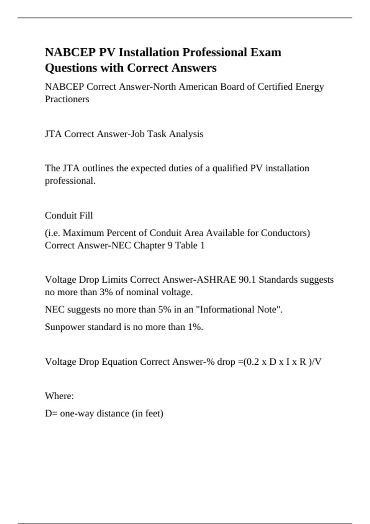 Voltage Drop Equation Correct Answer-% drop =(0.2 x D x I x R )/V