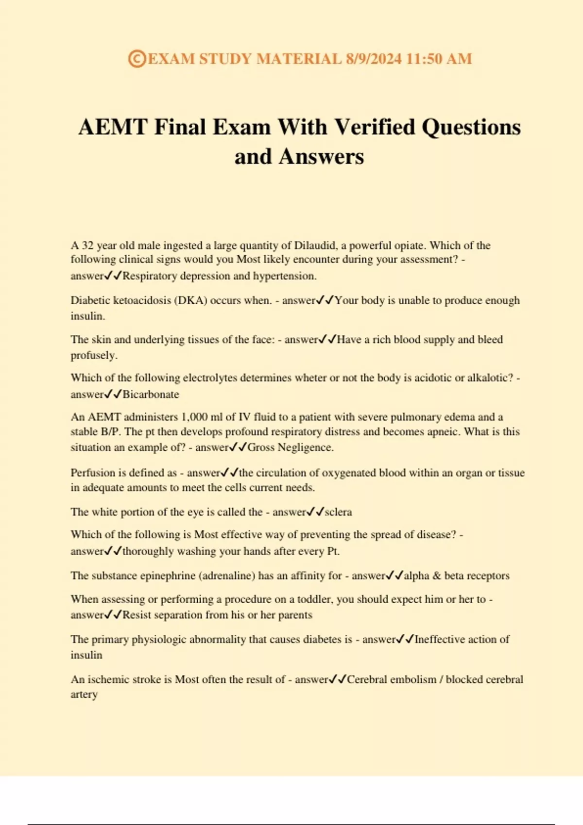 AEMT Final Exam With Verified Questions and Answers A 32 year old male ingested a large quantity of Dilaudid, a powerful opiate. Which of the following clinical signs would you Most likely encounter during your assessment? - answerRespiratory depression and hypertension. Diabetic ketoacidosis (DKA) occurs when. - answerYour body is unable to produce enough insulin. The skin and underlying tissues of the face: - answerHave a rich blood supply and bleed profusely. Which of the following electrolytes determines wheter or not the body is acidotic or alkalotic? - answerBicarbonate An AEMT administers 1,000 ml of IV fluid to a patient with severe pulmonary edema and a stable B/P. The pt then develops profound respiratory distress and becomes apneic. What is this situation an example of? - answerGross Negligence. Perfusion is defined as - answerthe circulation of oxygenated blood within an organ or tissue in adequate amounts to meet the cells current needs. The white portion of the eye is called the - answersclera Which of the following is Most effective way of preventing the spread of disease? - answerthoroughly washing your hands after every Pt. The substance epinephrine (adrenaline) has an affinity for - answeralpha & beta receptors When assessing or performing a procedure on a toddler, you should expect him or her to - answerResist separation from his or her parents The primary physiologic abnormality that causes diabetes is - answerIneffective action of insulin An ischemic stroke is Most often the result of - answerCerebral embolism / blocked cerebral artery ©EXAM STUDY MATERIAL 8/9/2024 11:50 AM One milliter (ml) is equivalent of - answer1 cc Cubic centimeter The shaft bone is called - answerDiaphysis An anaphylactic reaction impairs effective breathing secondary to - answerupper airway swelling Which of the following medications or medical devices may inhibit the bodys tachycardic response during shock? - answerBeta-blocker Which of the following is Not a crystalloid? - answerwhole Blood All of the following can lead to shock (hypoperfusion) Except - answerIncreased venous return to the atrium An 18 year old female is experiencing an axiety attack and is breathing at a rate of 40 breaths/min. Which of the following acid-base derangements will occur if her condition is not promptly treated? - answerCO2, H2CO3, Ph What is an enternal drug - answerAny drug that is administered along any portion of the GI tract. which of the following Most accurately describes the pathophysiology of angina pectoris - answerReversible process in which myocardial oxygen demand exceeds the supply of available oxygen. Why does the skin become flushed or red when a person is exposed to a hot environment - answerExpanded blood vessels bring heat to the skins surface As a triage officer you - answerMust not begin treatment until all pts. have been triaged a 63 year old male is being transported to the hospital for an acute exacerbation of his emphysema. He is on oxygen via nasal cannula at 4/lpm. during your reassessment you note that his mental status has deteriorated and his respirations have become markedly slow and shallow. You should - answerAssist his ventilations with a BVM A 33 year old male complains of generalized weakness and chest discomfort that began following his morning workout at the gym. He is conscious and alert, but restless. Your assessment reveals a BP of 130/60 , pulse of 78 bpm. and occasionally irregular, respirations of 16 and unlabored, and a SPO2 of 98% on room air. He has prescribed nitro tabs and states that he took one without relief. Appropriate treatment for this pt includes - answerO2 via N/C up to 324 mg aspirin, saline lock, additi