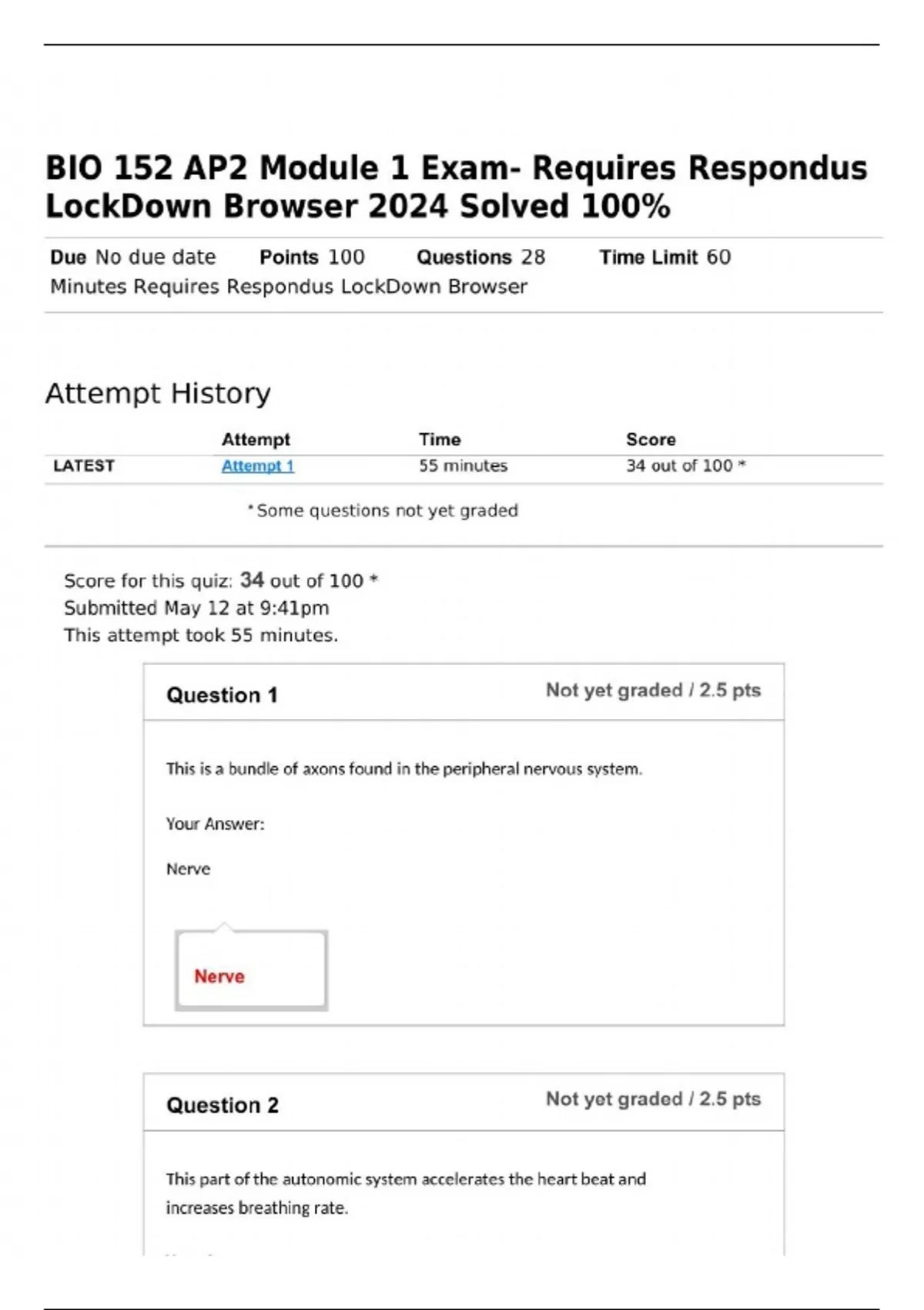 BIO 152 AP2 Module 1 Exam- Requires Respondus LockDown Browser 2024 Solved 100%