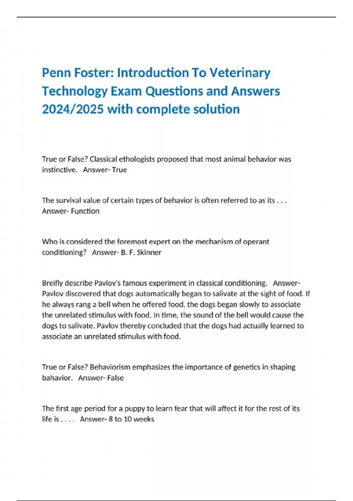 Penn Foster: Introduction To Veterinary Technology Exam Questions and Answers 2024/2025 with complete solution