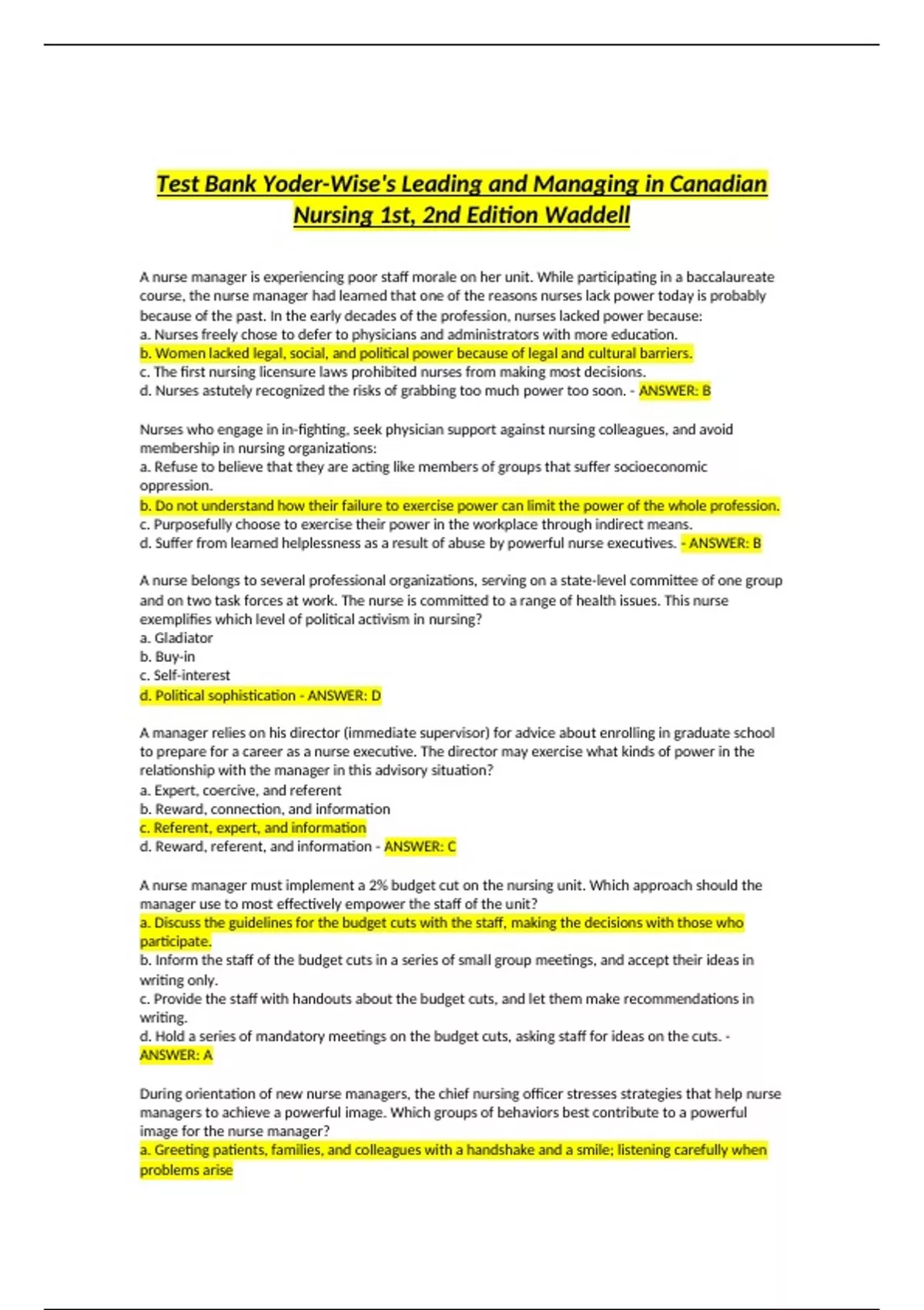 d. Nurses astutely recognized the risks of grabbing too much power too soon. - ANSWER: B