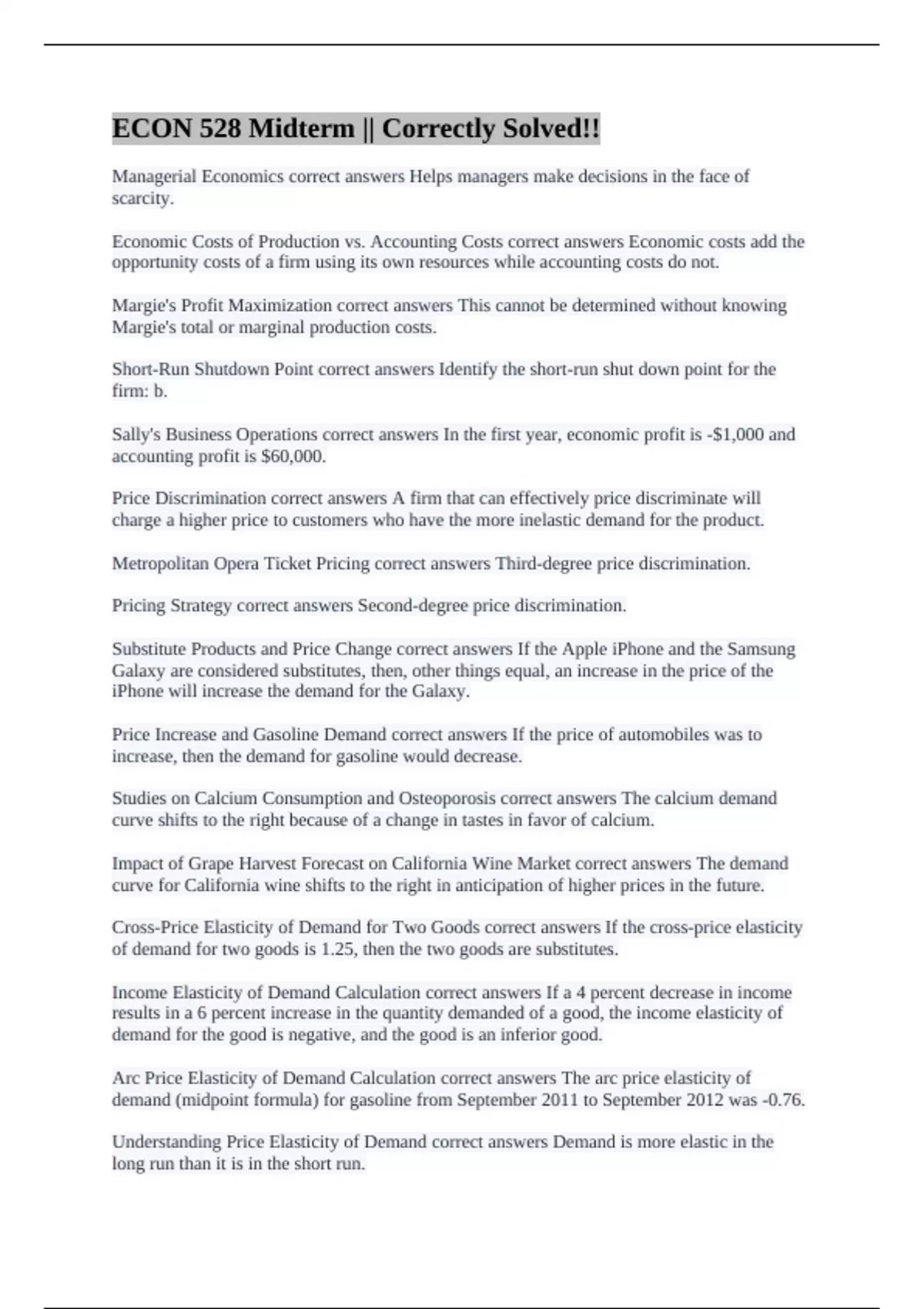Managerial Economics correct answers Helps managers make decisions in the face of
